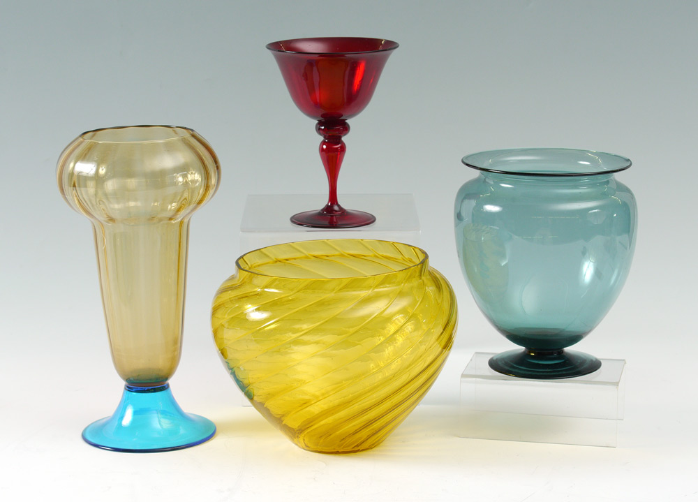 3 PIECE STEUBEN VASES & 1 WINE GLASS: An assembled 4 piece collection, all unsigned, to include 1) Amber vase with fluted bulbous top and body, blue foot, 9 7/8'' h. x 5 1/2''. 2) Large amber vase with twist design, 6'' h. x 8 1/4''. 3) Light blue vase, 6 3/4'' x 6''. 4) Ruby red wine stem, 6'' h.