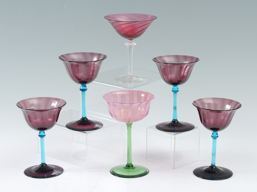 6 ASSORTED STEUBEN ART GLASS STEMS: 6 pieces total, all unmarked, to include 1-4) Amethyst fluted bowl and foot with blue stem, 5 3/4'' h. 5) Striated cranberry and frosted bow, green stem and foot, 6 1/4'' h. 6) Martini with twist cranberry bowl, clear stem and foot, 5 1/2''.