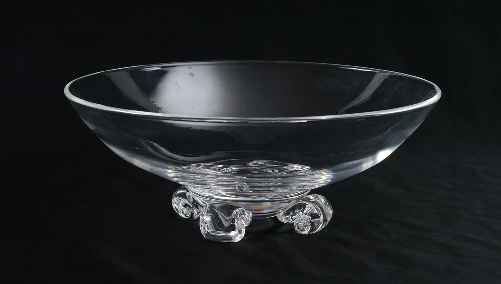 LARGE SIGNED STEUBEN CENTER BOWL: With 4 scroll feet, engraved Steuben on base. Measures 4'' h. x 10 1/2''.