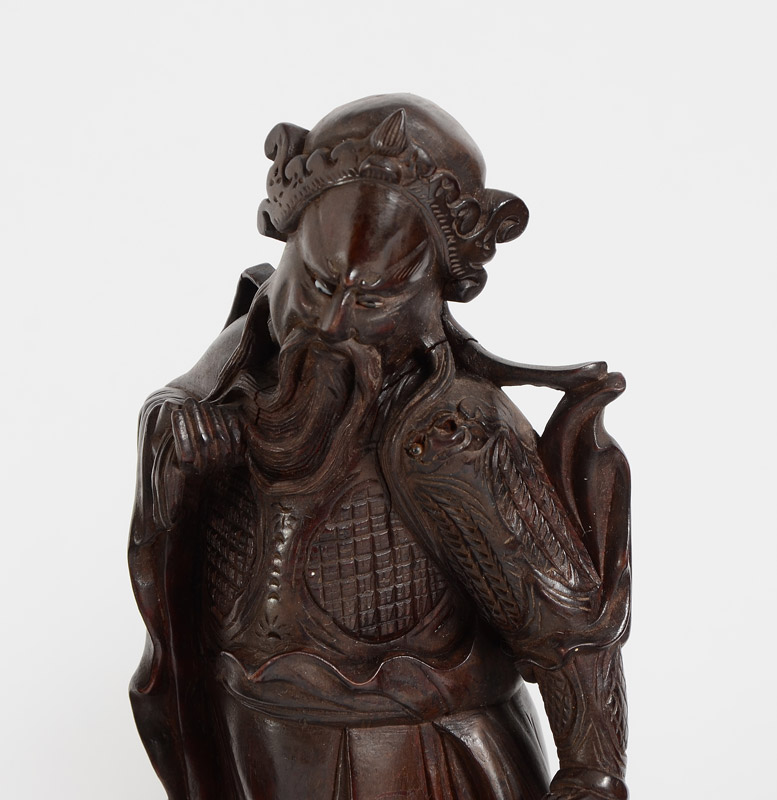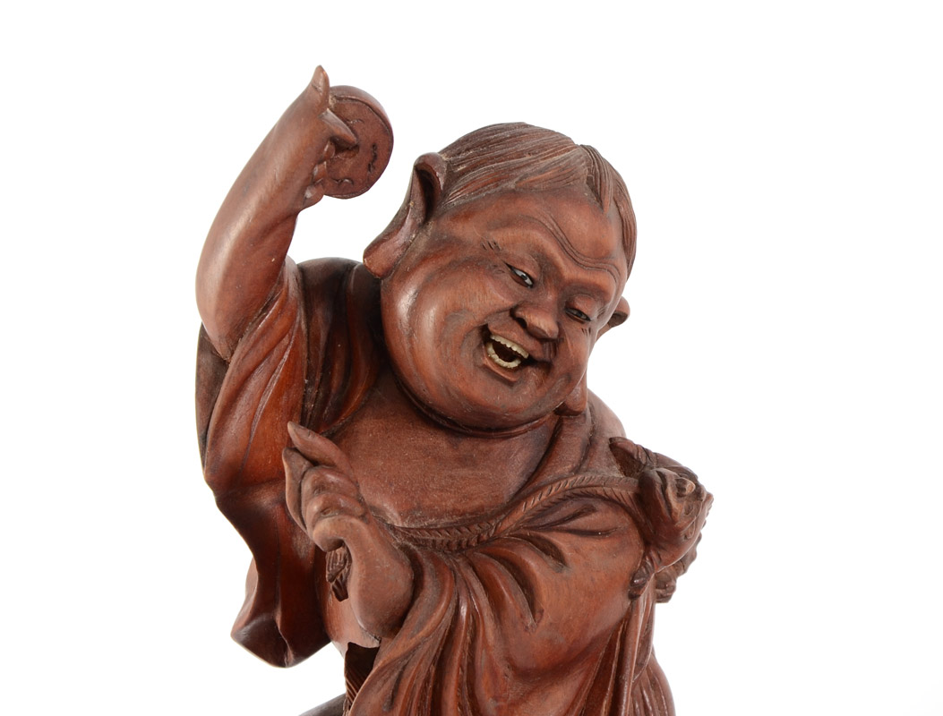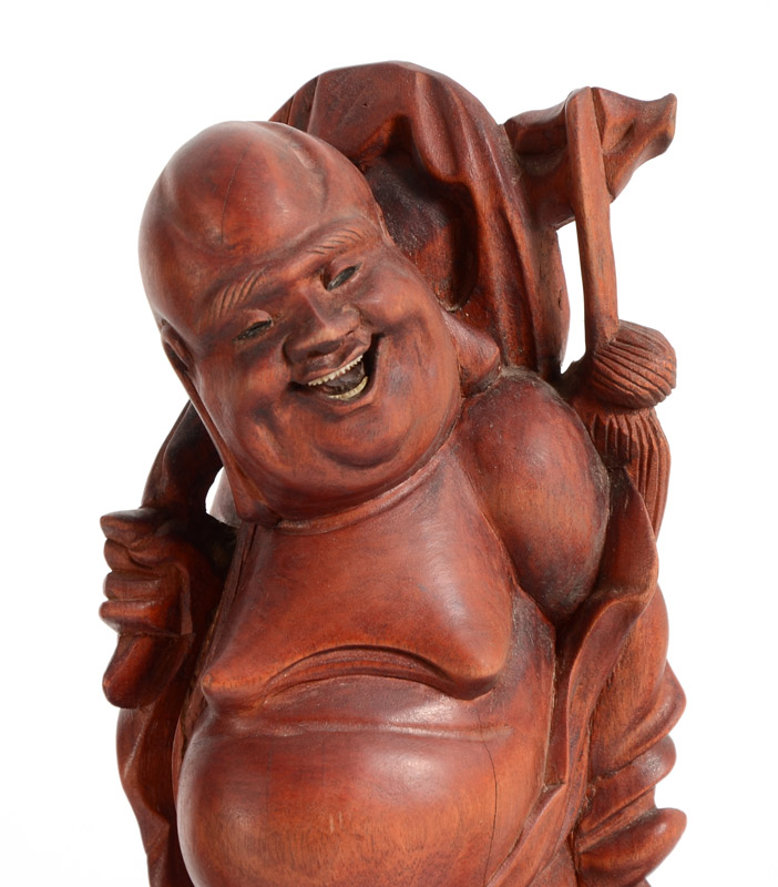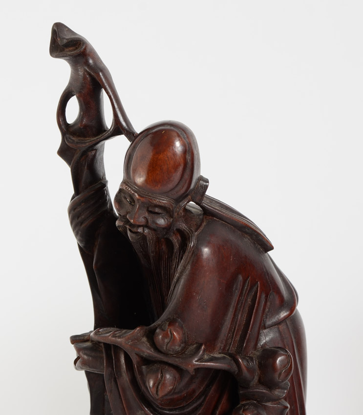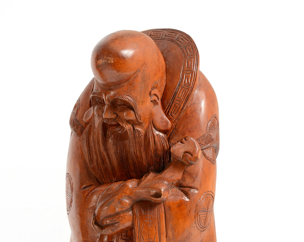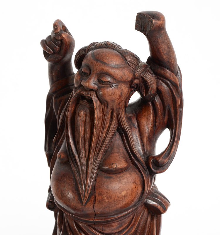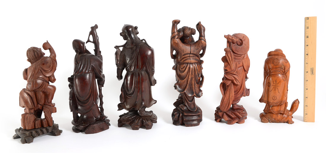 6 LARGE ORIENTAL WOOD CARVINGS: 6 assorted Oriental gods or immortal figures. Tallest measures 12 1/4'' h. x 4 1/2'' x 3 3/4''.