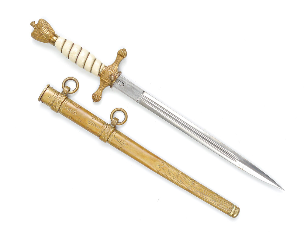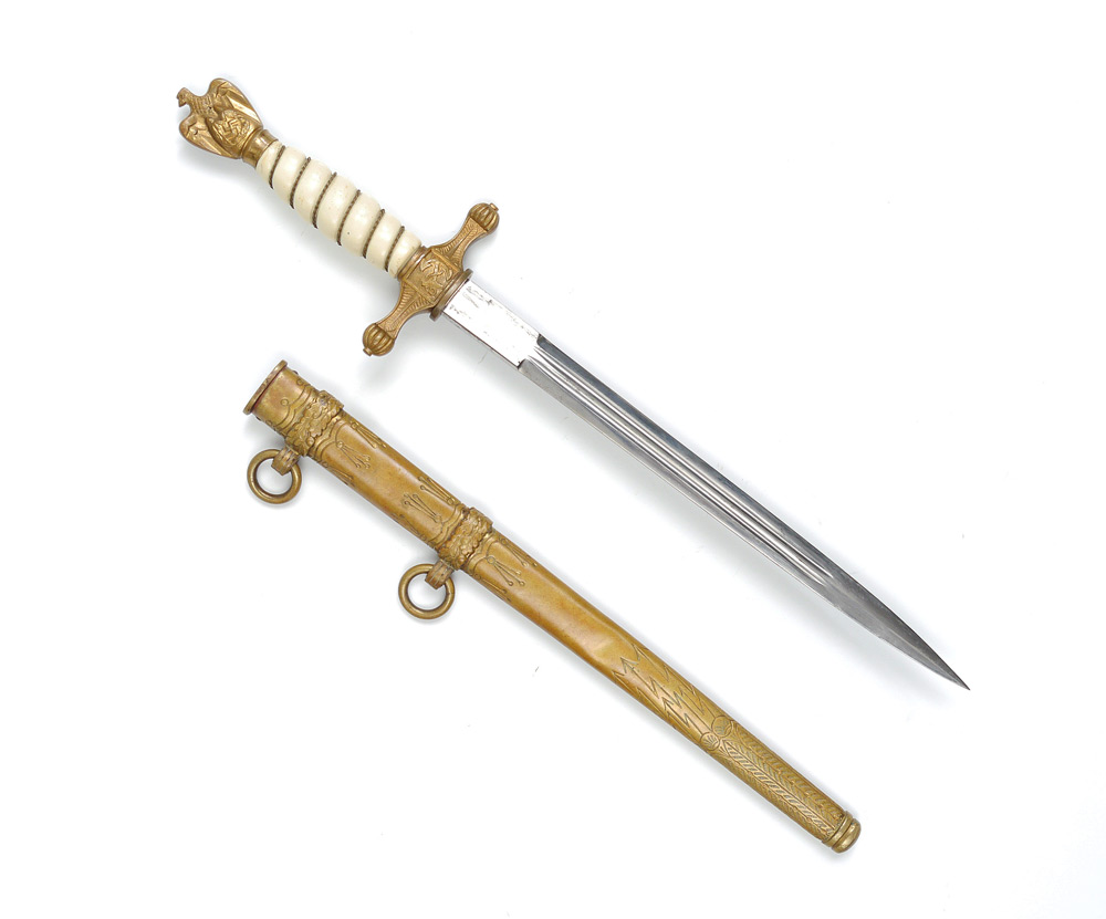 WWII GERMAN KRIEGSMARINE NAVAL DAGGER: Hilt with eagle finial, ivory appearance grip with original twist wire, cross guard with anchor and push button clasp. Unmarked 9 3/4'' blade. Engraved brass scabbard with lower lightning bolt design. Overall measures 16 3/4'' long.