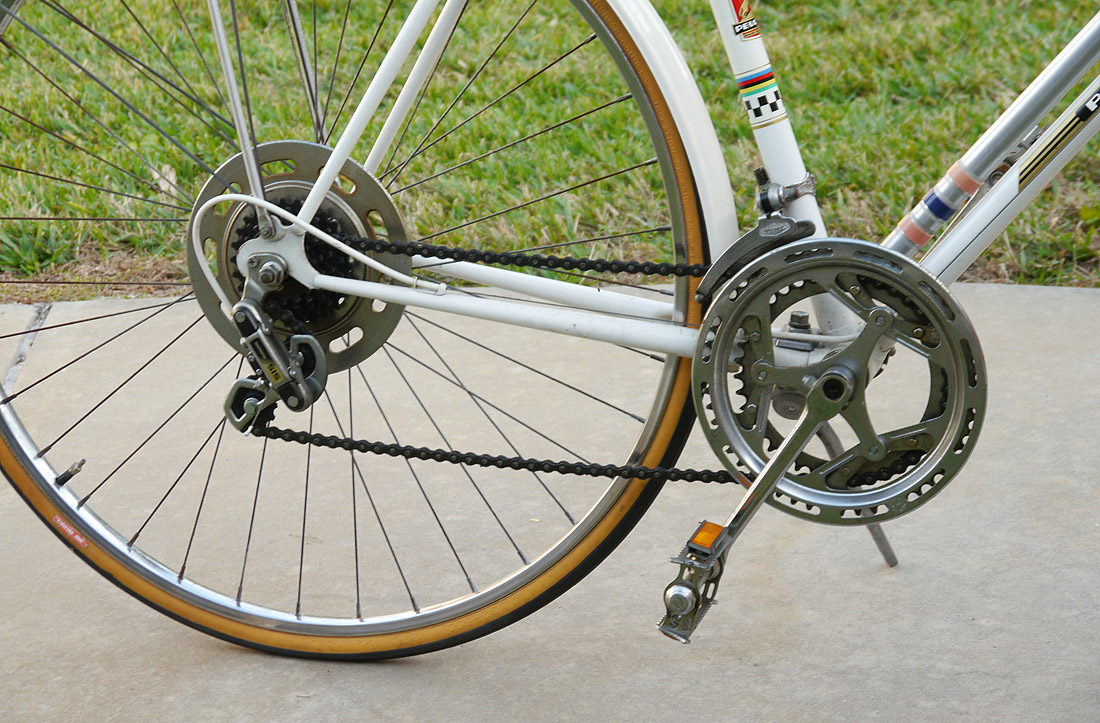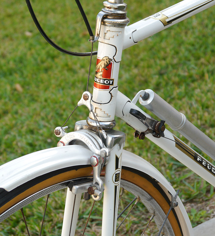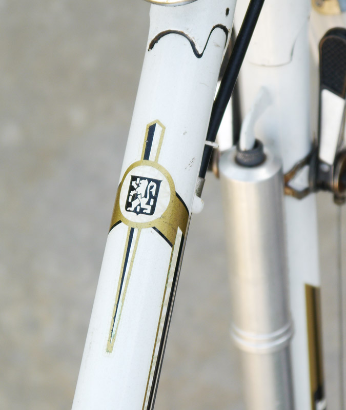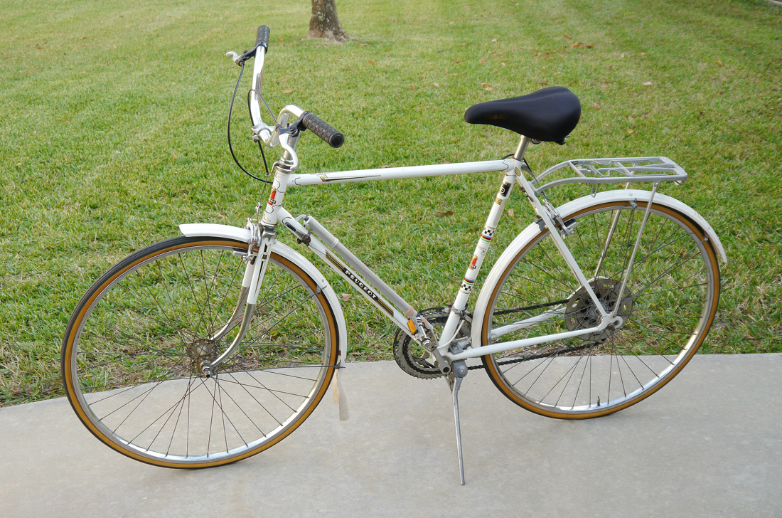 VINTAGE PEUGEOT BICYCLE: Mens bicycle, white with original decals. Bike pump and rear rack accessories. Estate of William A.C. Pettit