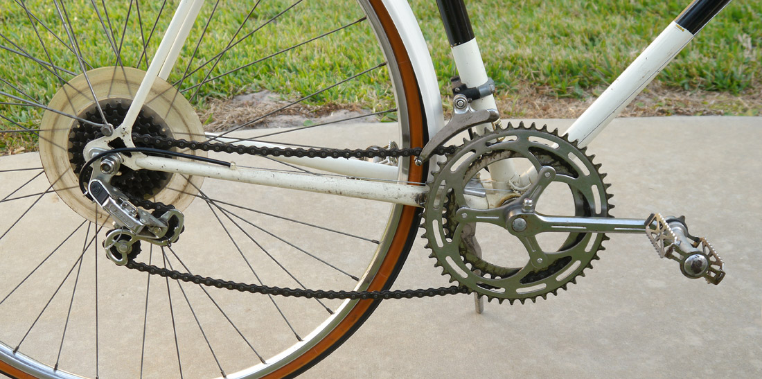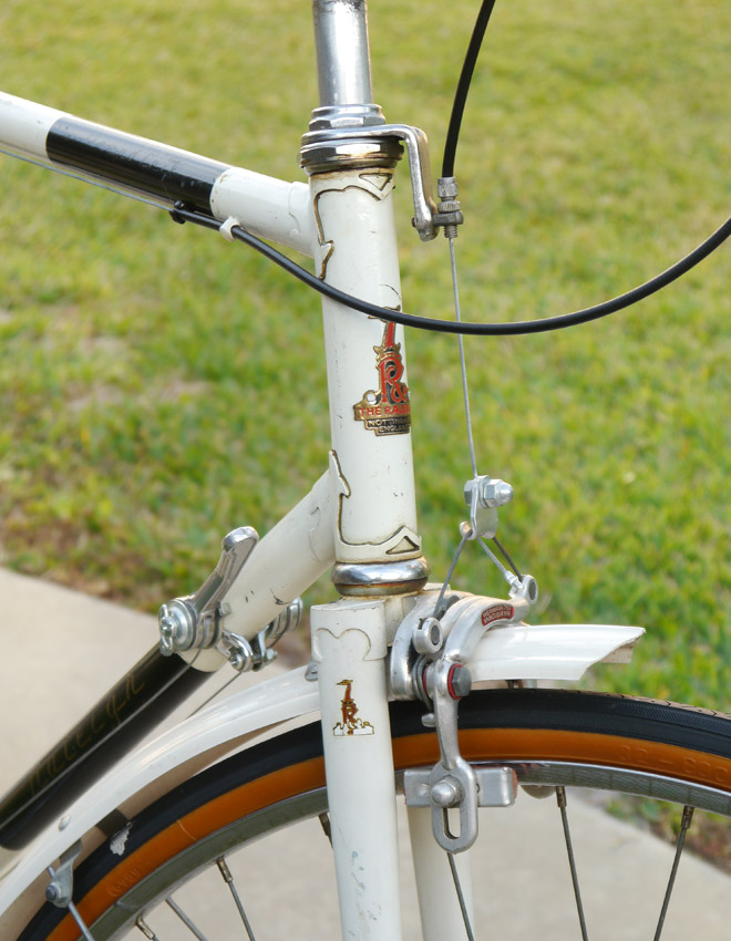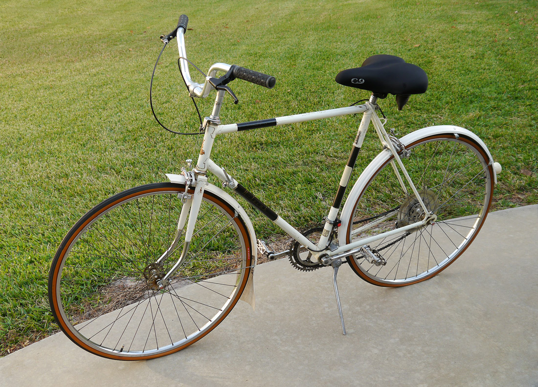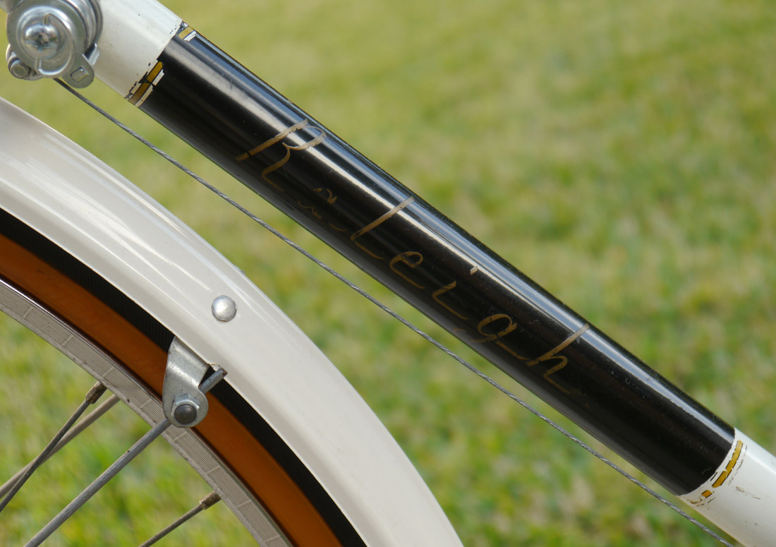 VINTAGE RALEIGH BICYCLE: Mens bicycle, white with original decals. After market seat. Estate of William A.C. Pettit