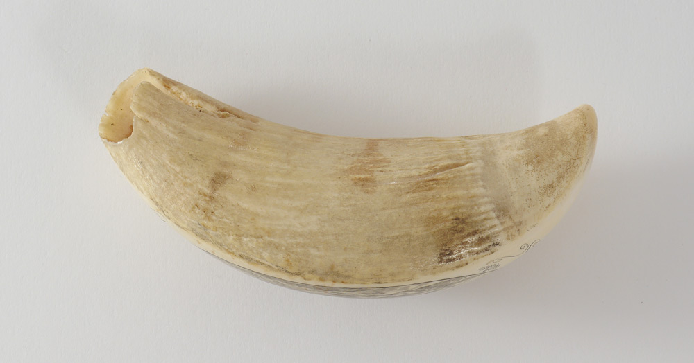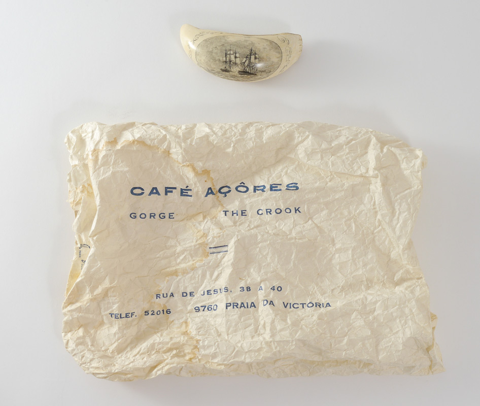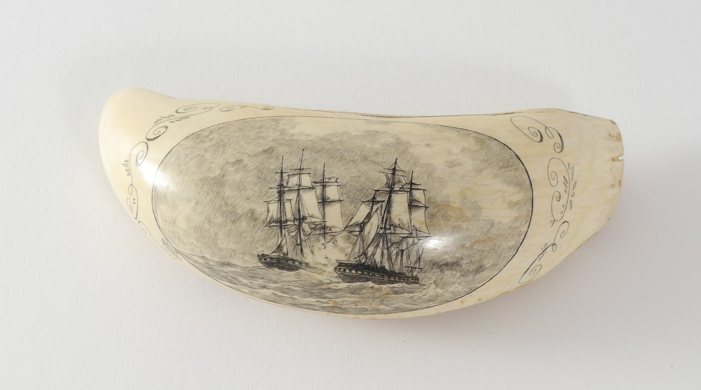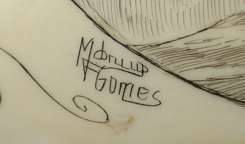 MADRUGA GOMES SCRIMSHAW WHALE TOOTH: Finely detailed scene of 2 clipper ships at battle, signed Madruga F. Gomes. Gomes was known throughout the Azores for detail portraits and other scrimshaw work. Tooth measures 4 1/2'' long. Sold with original ''George the Crook, Cafe Acores (Azores)'' paper bag from when it was purchased.