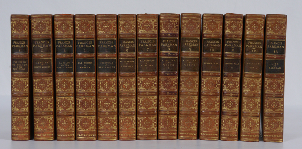 PARKMAN, Francis: 13 volumes ''Francis Parkman Works'', New Library Edition, full leather covers, gilt top page ends, interior maps and charts. 1914, Little, Brown & Co., Boston.