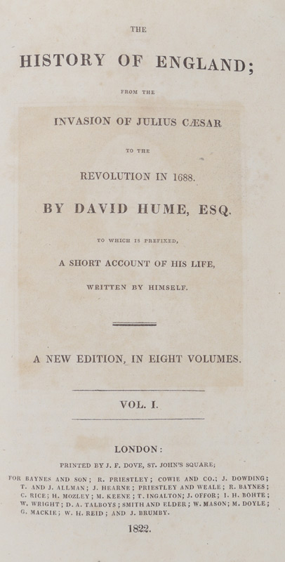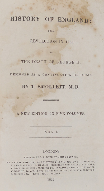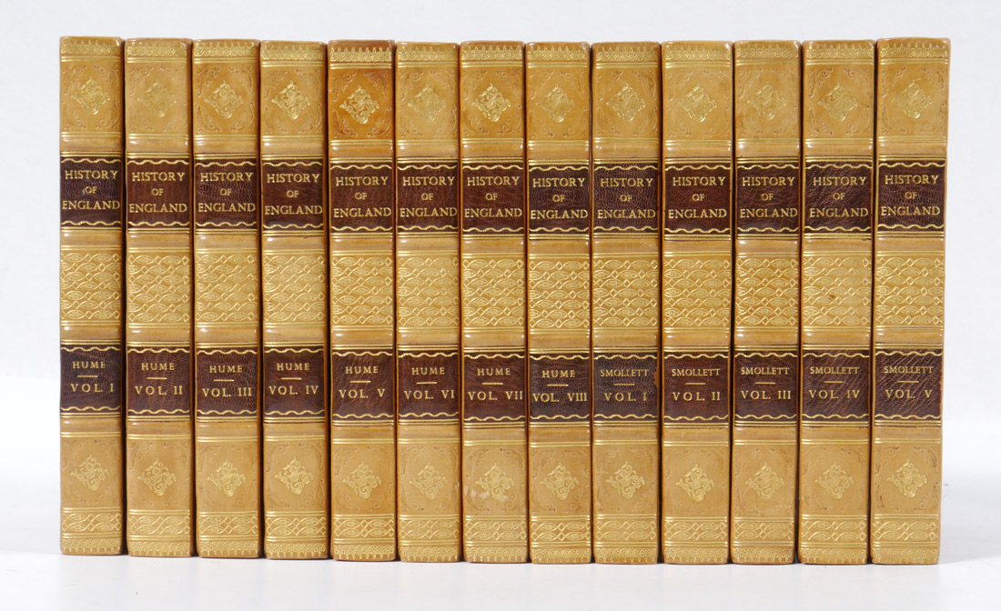 SMOLLETT, T. and HUME, David: 13 total volumes ''History of England'', 5 volumes by Smollett, 8 by Hume. Full calf, marbled page ends. 1822, J. F. Dove, London.