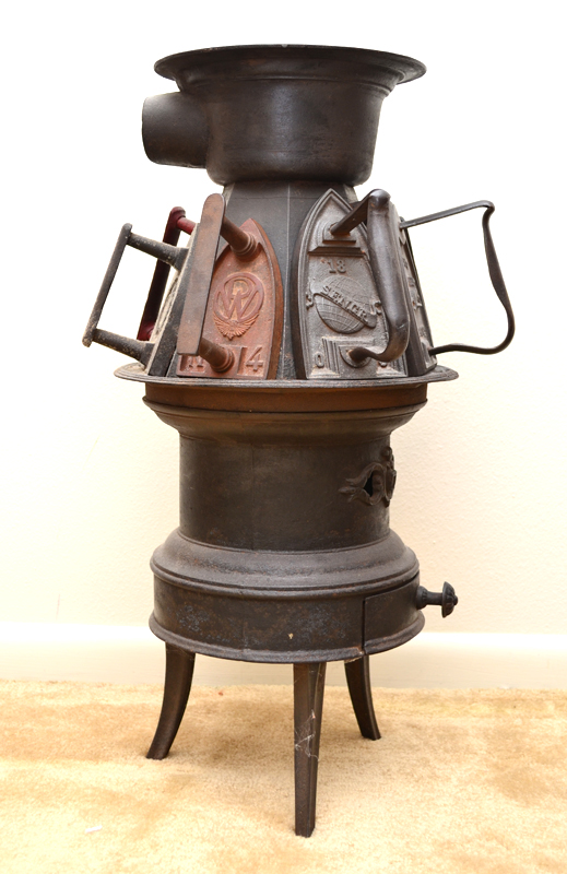 19th C LAUNDRY STOVE IRON HEATER. Flat top cast iron sold with 7 irons, measures 28'' tall, the top is 10'' dia.