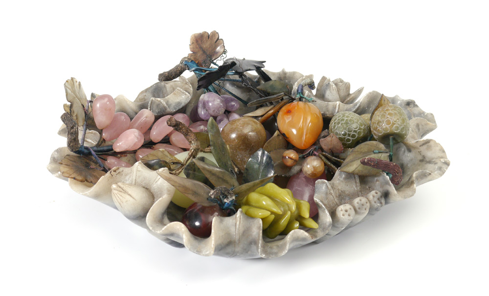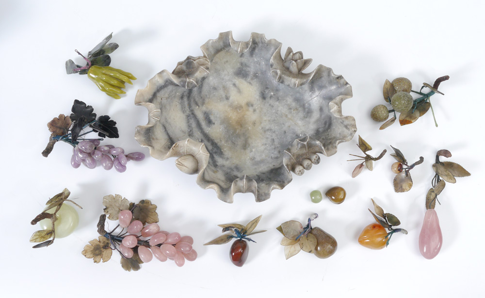 JADE & STONE FRUIT WITH CARVED MARBLE TRAY: Intricately carved marble bowl in a lotus flower motif filled with assorted ''fruit''. Quartz grapes in purple and pink; cherries, plums and apples of assorted stone, apple might be jade; even a buddha hand fruit. Bowl measures approx. 3''h. x 14'' x 11.5''