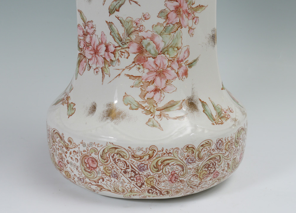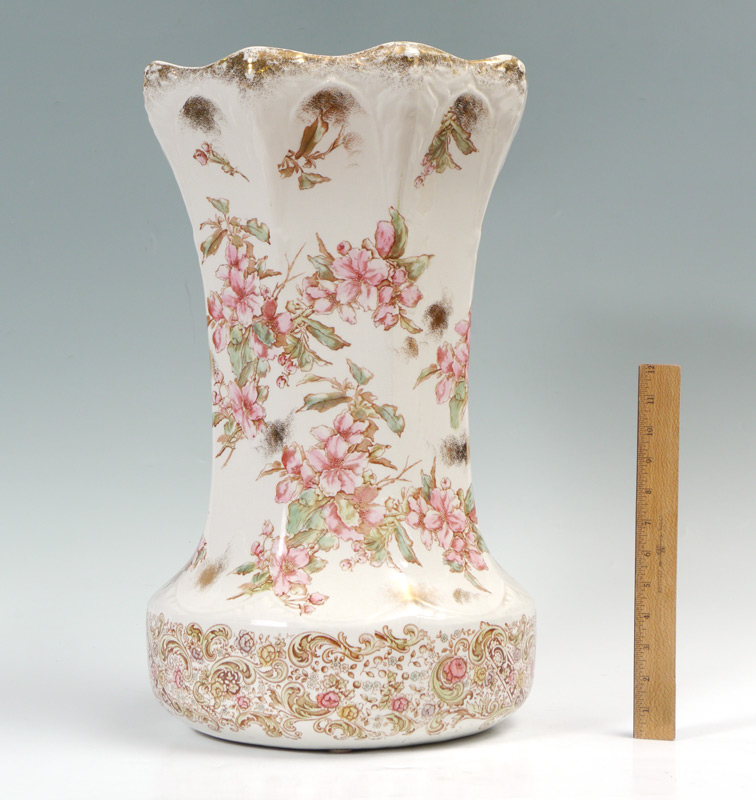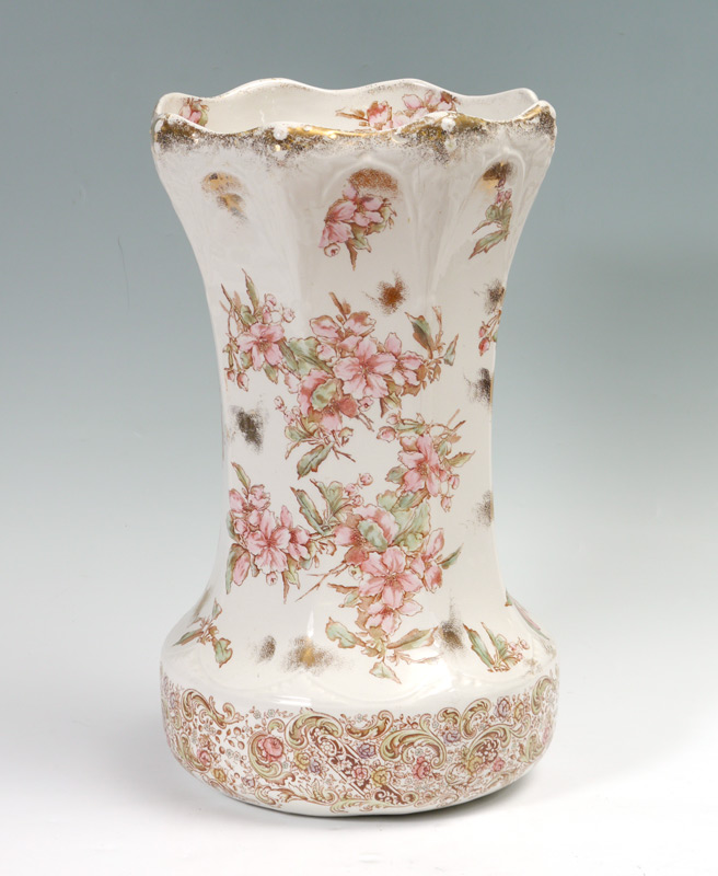 MADDOCK'S WORKS PORCELAIN UMBRELLA STAND: Floral transfer decoration with gilt accents. Marked on base Maddock's Works, Lamberton, Royal Porcelain. Measures 22'' h. x 13 1/2''.