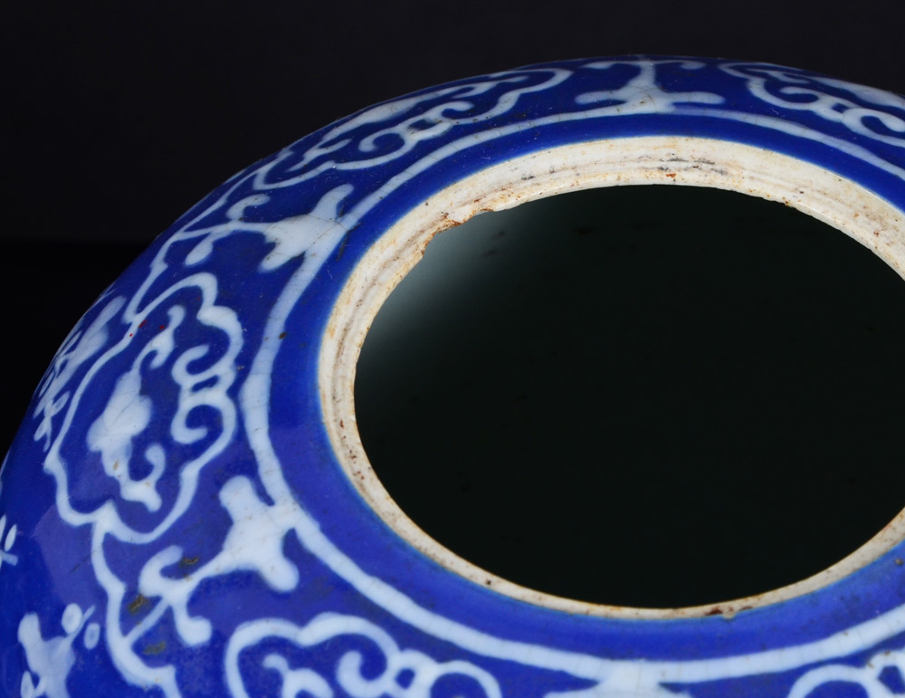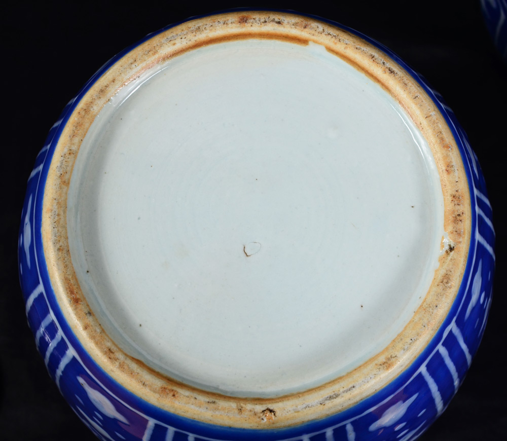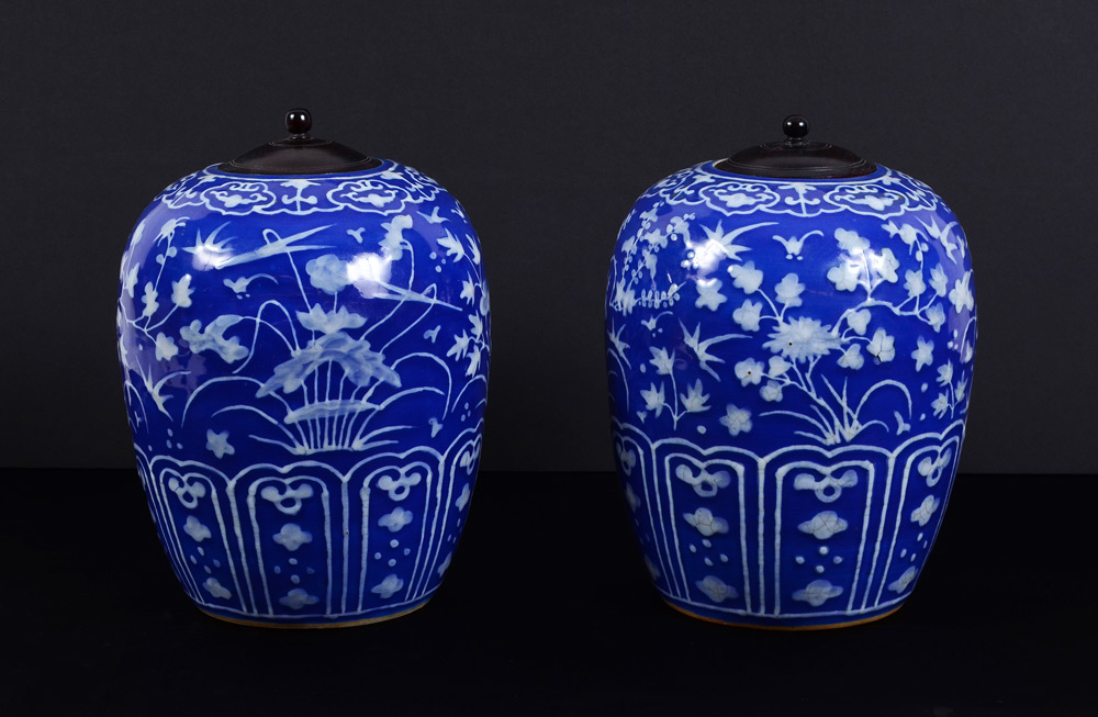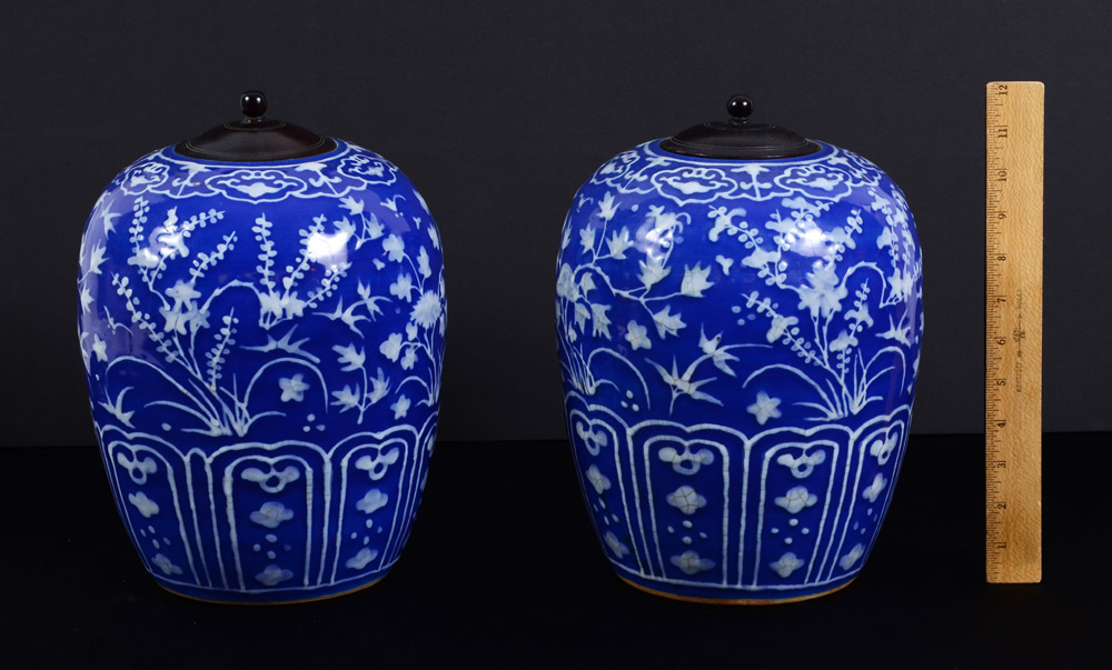 PAIR COVERED BLUE & WHITE GINGER JARS: Blue ground with raised white floral decoration, wood lids. Unmarked, overall 11 1/2'' h. x 8 1/2''.