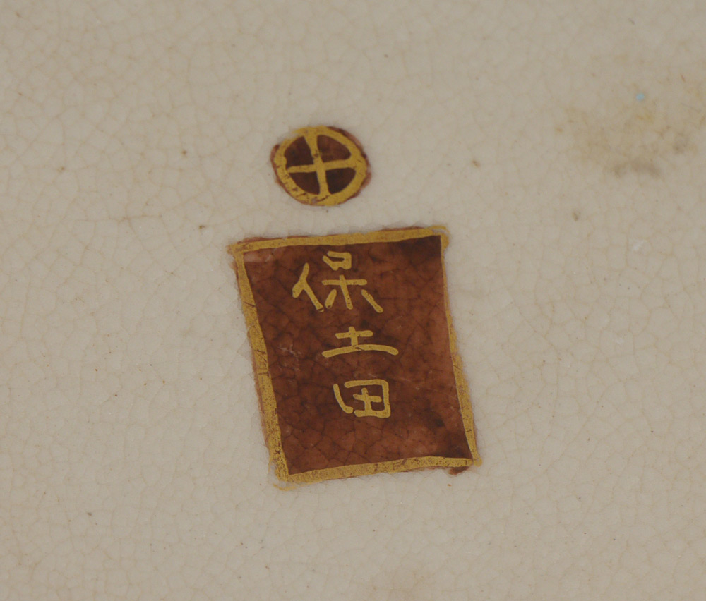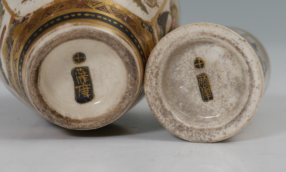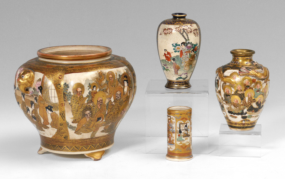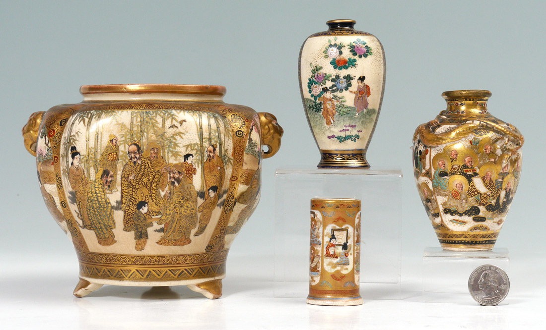 4 PIECE GROUP OF JAPANESE SATSUMA POTTERY: 4 pieces total to include 1) 4 sided vase with shaped sides, figural ''handles''. Signed, 5 1/8'' h. x 6 1/2''. 2) Diminutive bud vase, cobalt rim and ground. 3 3/4'' h. 3) Bud vase with applied dragon, signed, 3 7/8'' h. 4) Miniature umbrella stand form vase, signed, 2 1/2'' h.