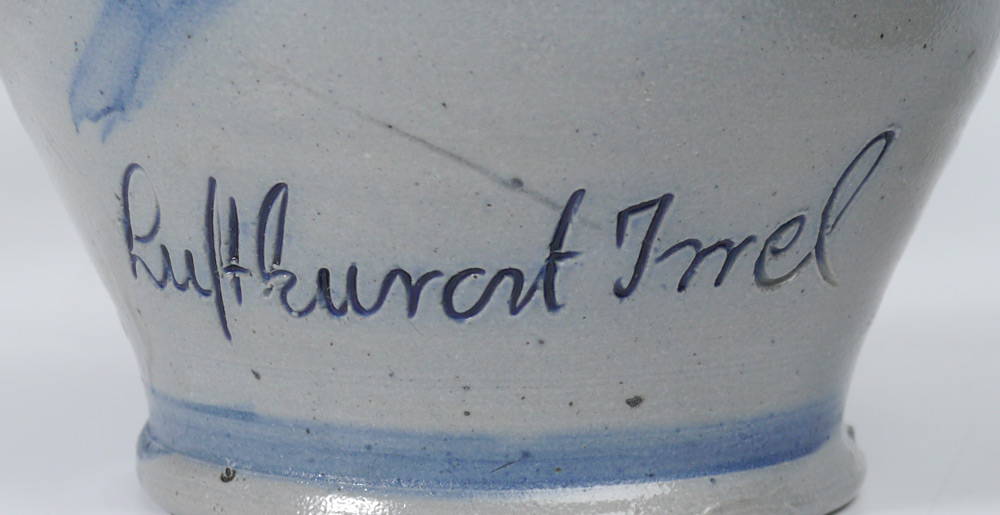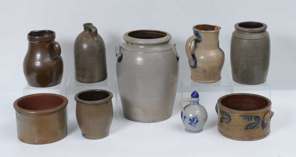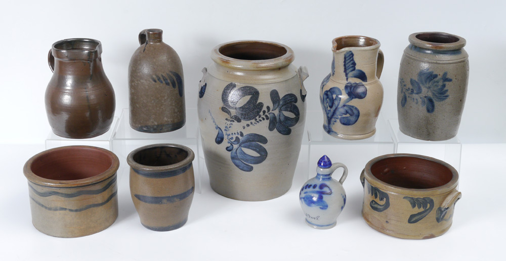 9 PIECE ASSEMBLED STONEWARE COLLECTION: 8 of the 9 have blue hand decoration with assorted motifs, one pitcher undecorated. Tallest 4 gallon crock measures 14 1/2'' h. x 11''.
