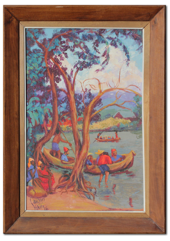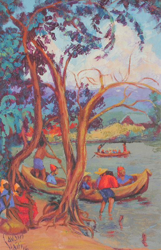 SAVAIN, Petion, (Haitian, 1906-1973): Haitian Painting with Figures in Boats and on the Shore of a River, Oil/Canvas, 24'' x 16'', signed lower left, marked Haiti, dated '66, encased in a wood frame 29 1/4'' x 21 1/2''.