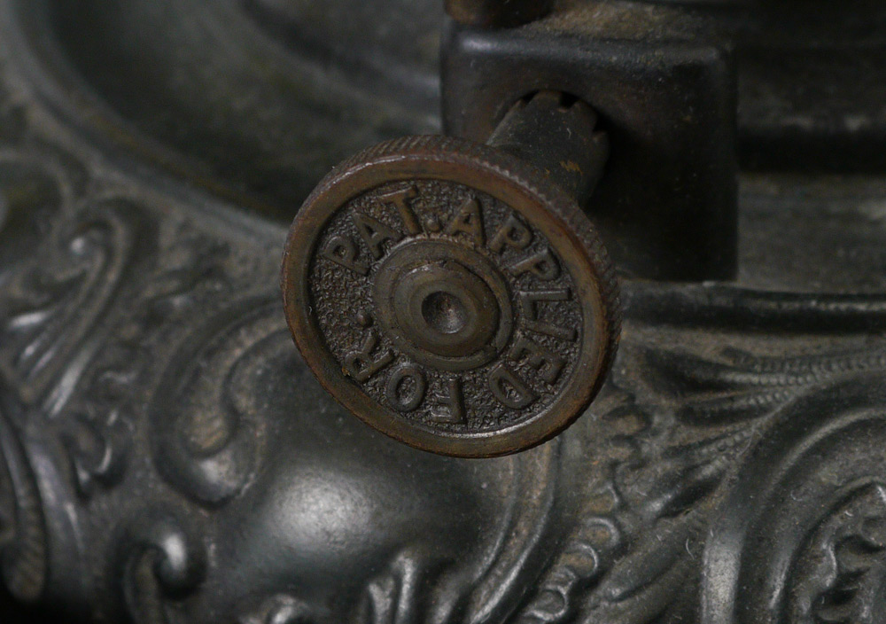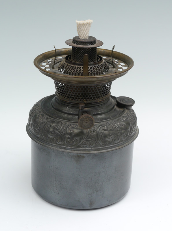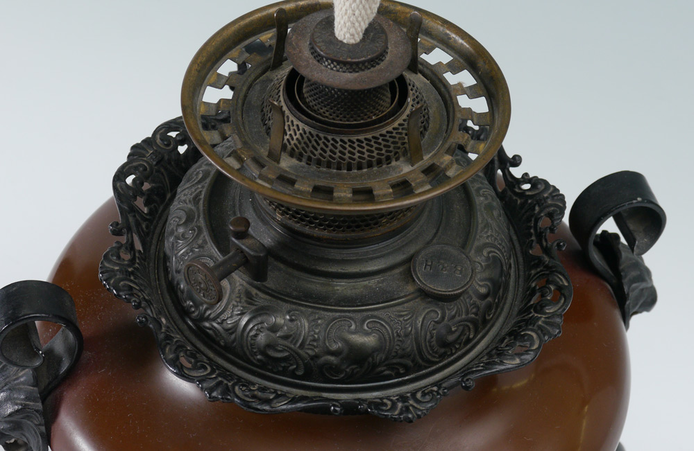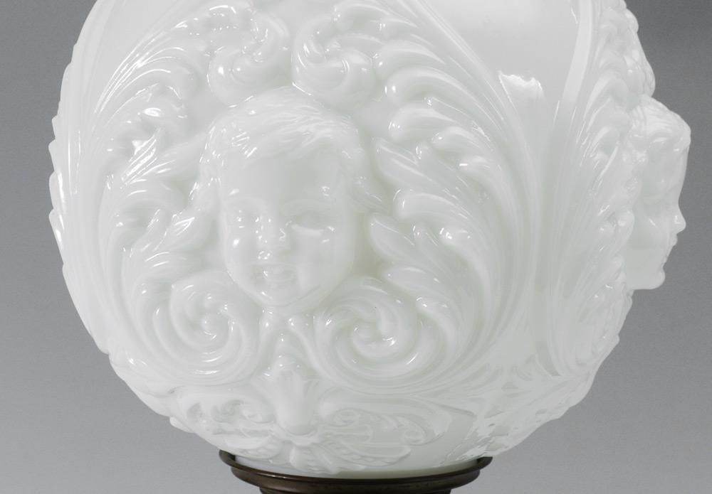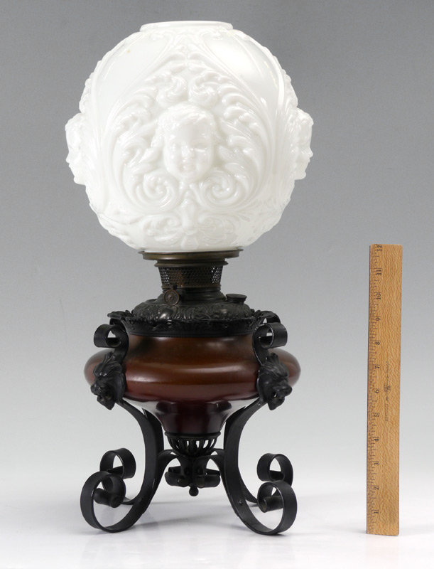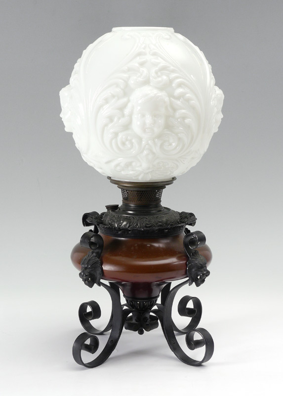 BRADLEY & HUBBARD VICTORIAN OIL LAMP: Copper body, wrought iron legs with lion masquerons. Font insert marked with B & H on cap. Embossed cherub face milk glass shade. Base measures 13'' h. x 12''. Shade 10'' h. x 10 3/4''.