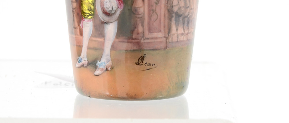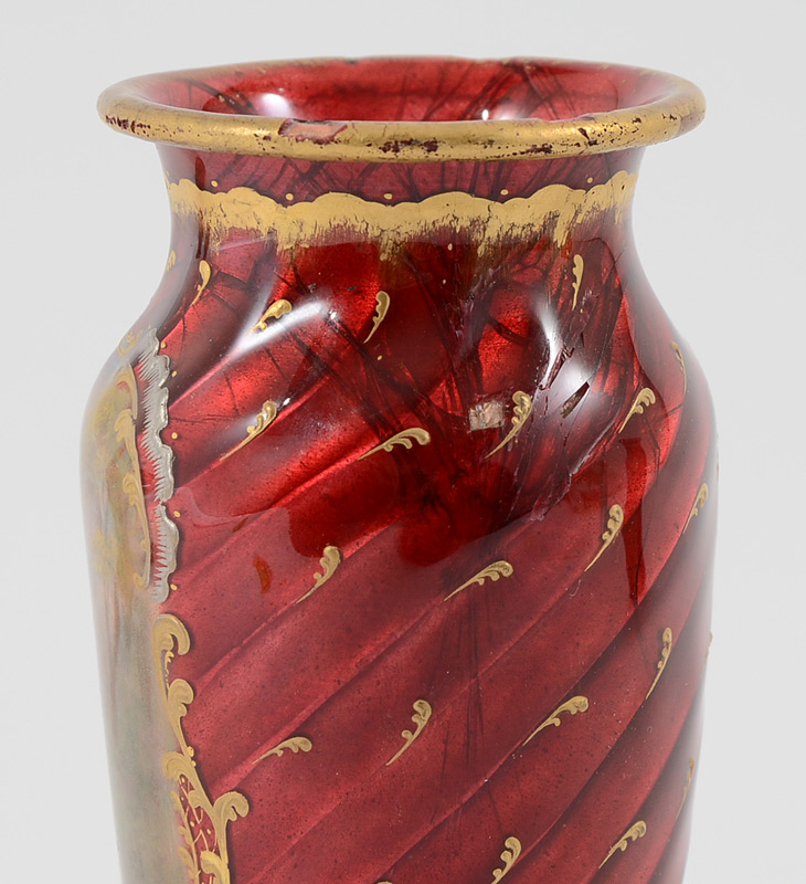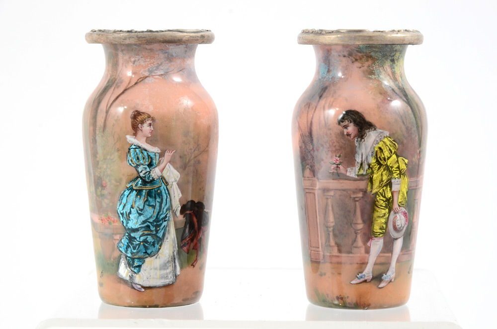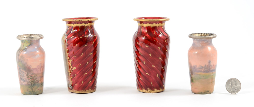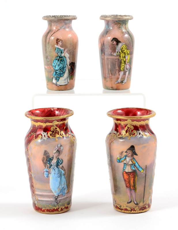 4 PIECE ENAMEL MINIATURE PORTRAIT VASES: 2 pairs, 4 pieces total to include 1-2) Red ground with portrait of woman in her finest and man holding staff and glasses on other, gilt accents on both. Unmarked, 4 1/2'' h. x 2 1/4''. 3-4) Outdoor genre scene ground with woman on one and man presenting a rose on the other. Unmarked, 3 1/2'' h. x 1 3/4''.