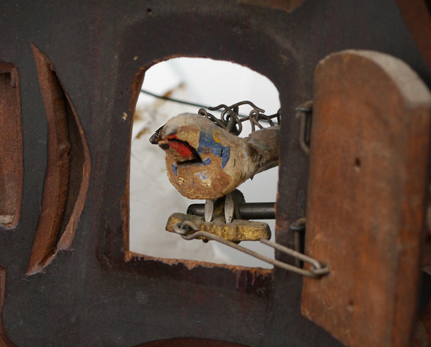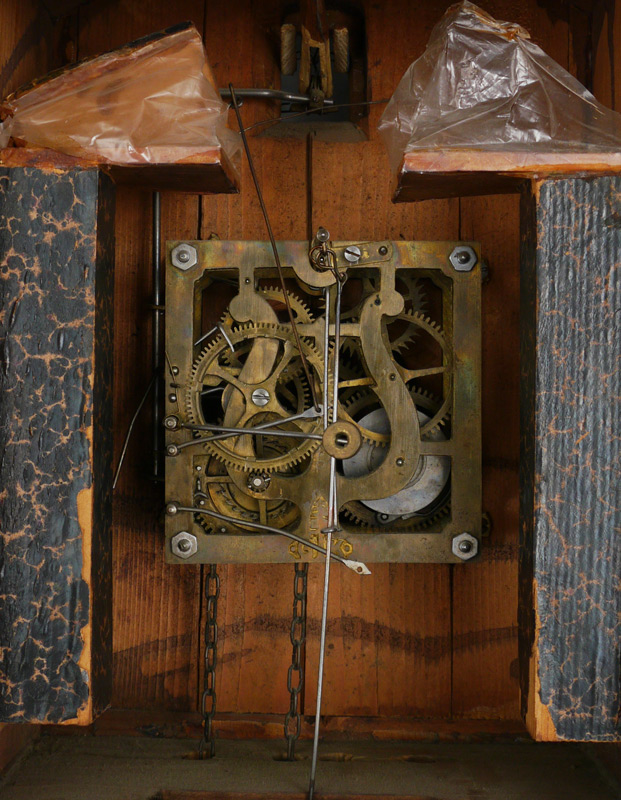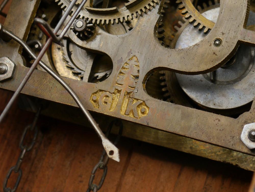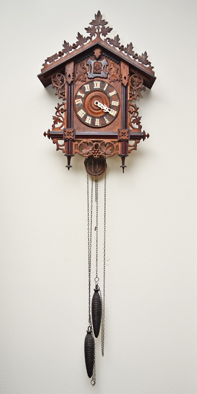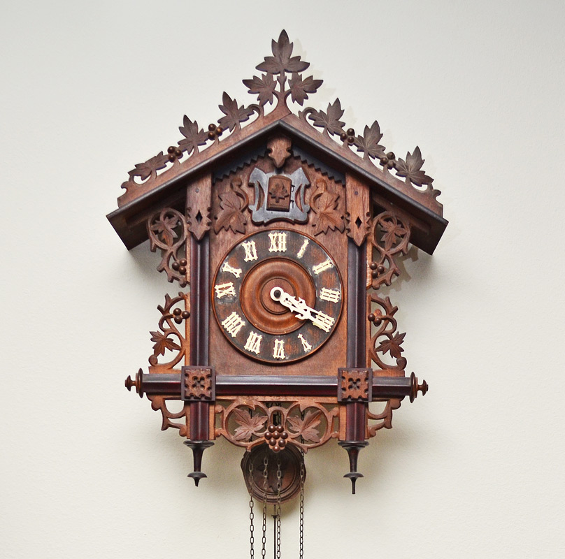 GERMAN CARVED CUCKOO CLOCK: Carved oak leaf crest, walnut case with applied carved decoration. Dial with light wood Roman numerals. Dual pinecone weight driven time and strike movement marked GK with pine tree. Overall measures 21 1/2'' h. x 15 3/4'' x 6 3/4''.