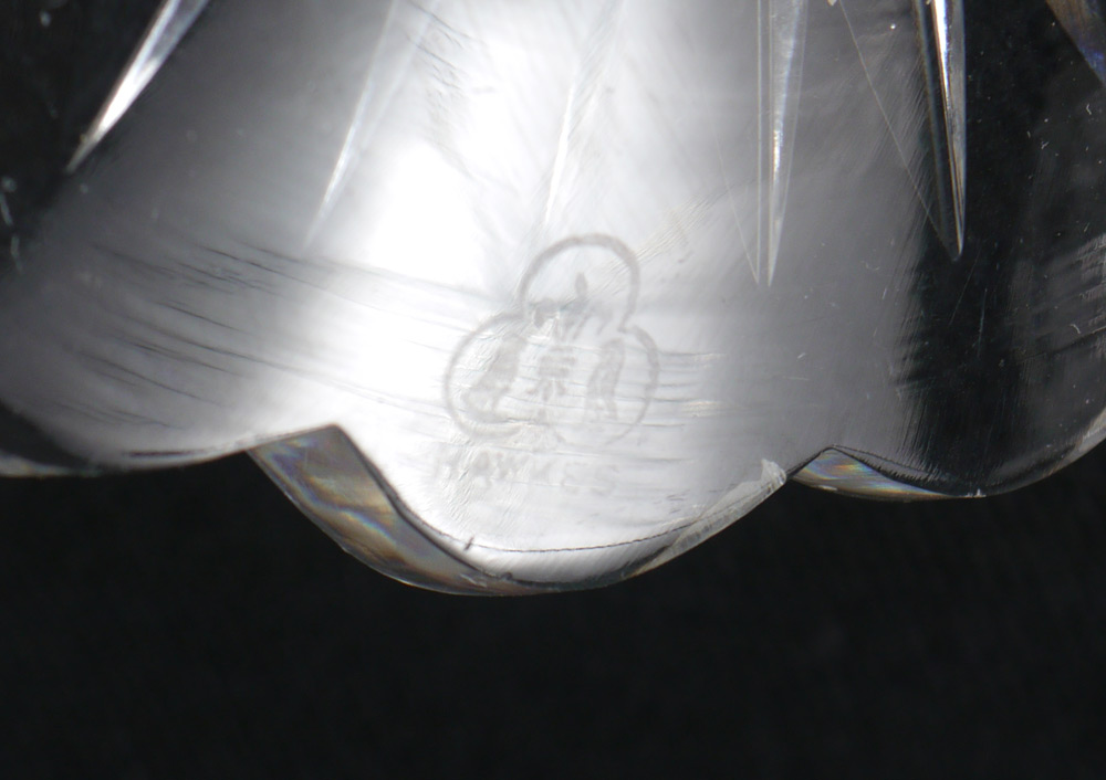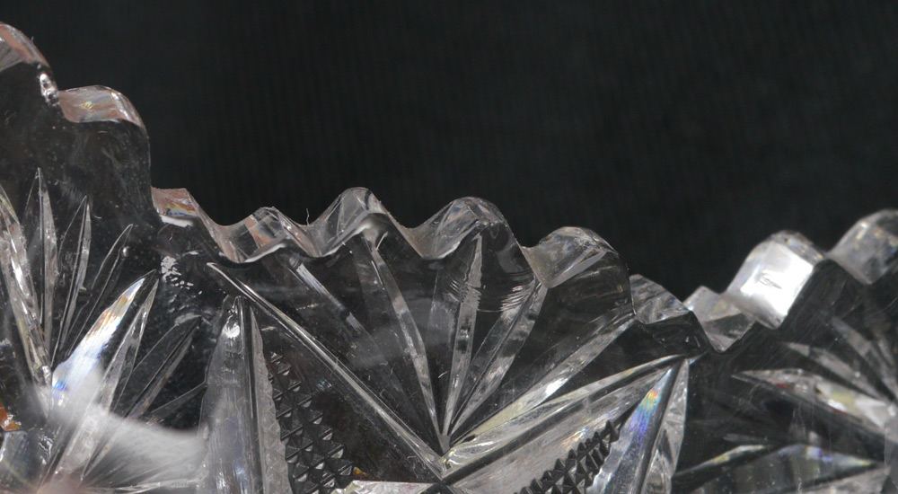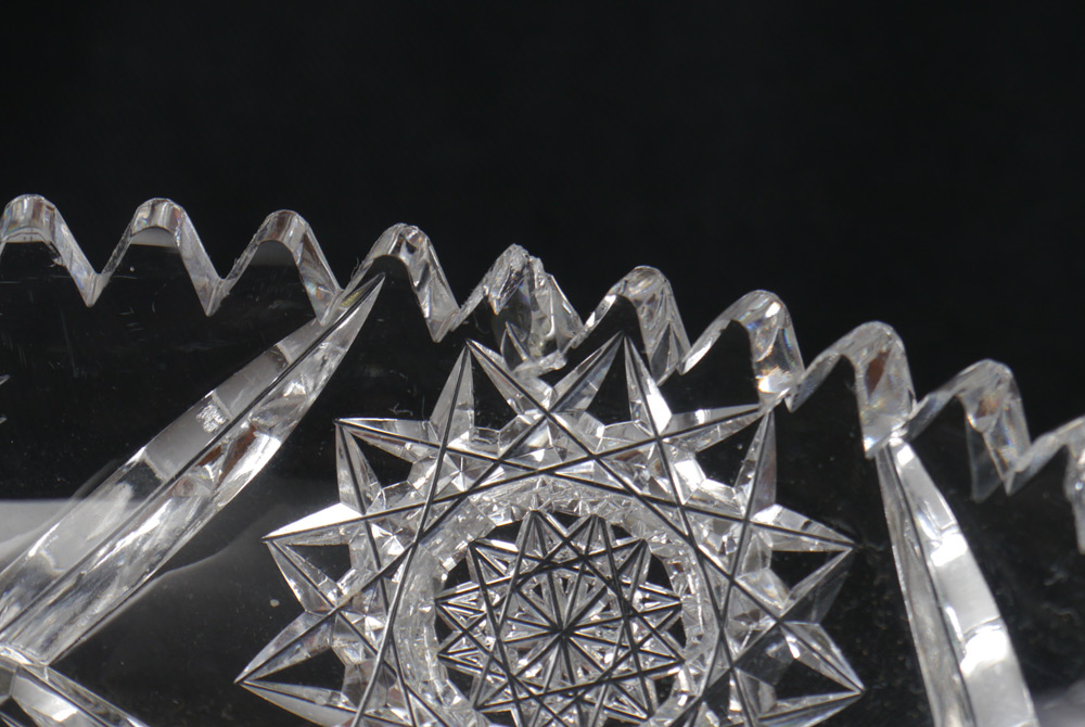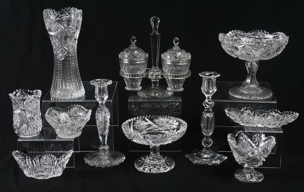 FINE BRILLIANT CUT GLASS GROUP: 10 piece estate collection to include a 7 1/2'' vase, 3 compotes (4 1/2''-5'' tall), 2 unique candle holders, small dishes and a double jam jar stand. At least 2 pieces signed, one Hawkes, the other Boven.