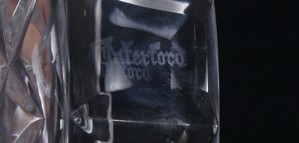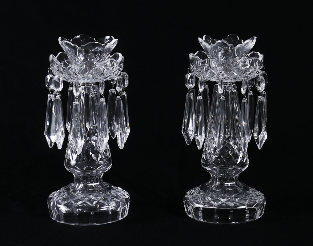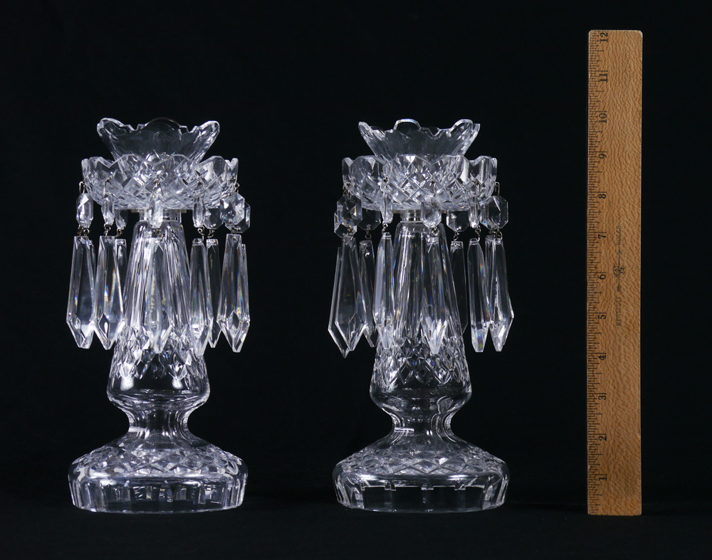 PAIR WATERFORD CRYSTAL LUSTERS: Each holds single candle, cut glass bobeches, prism drops, cut glass body marked Waterford. Each measures 10'' h. x 4 3/4''.