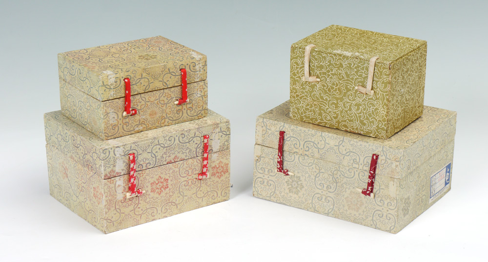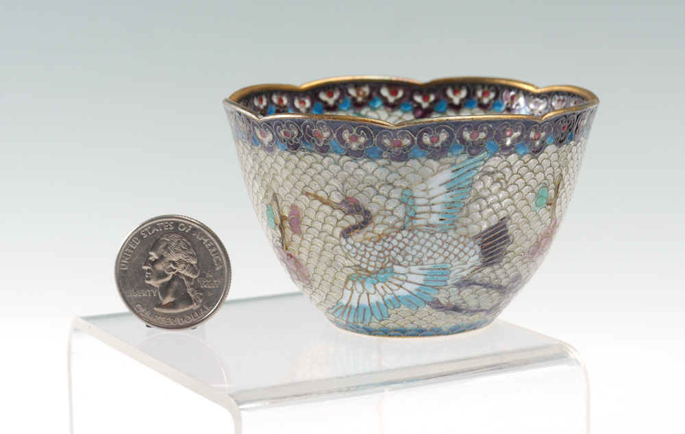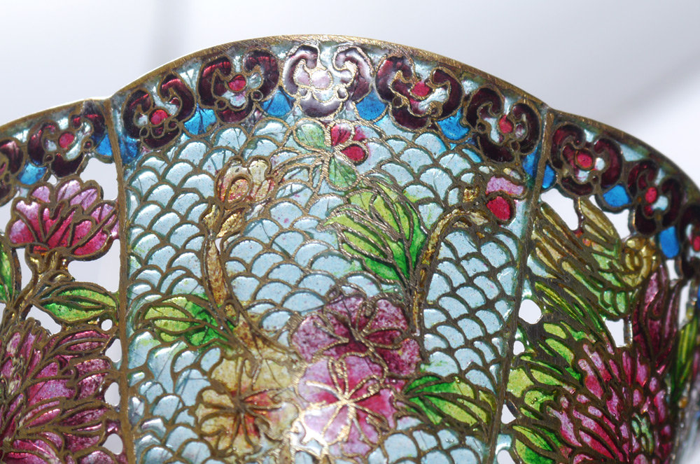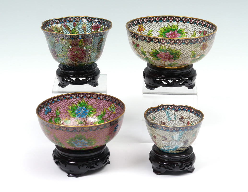 4 CHINESE PLIQUE A JOUR BOWLS: 4 bowls in graduating sizes with various plique a jour and open work motifs. Each sold with stand and original presentation box. Smallest bowl 1 7/8'' h. x 3'', largest 2 1/4'' h. x 5''. Largest box 4 1/2'' h. x 8 1/4'' x 6 1/2''.