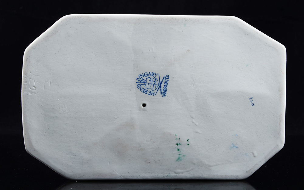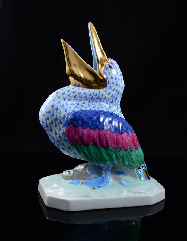 HEREND PORCELAIN PELICAN FIGURINE: Polychrome hand painted, impressed VBO on top. Base with blue Herend mark. Measures 8 1/2'' h. x 6 1/2'' x 3 3/4''.