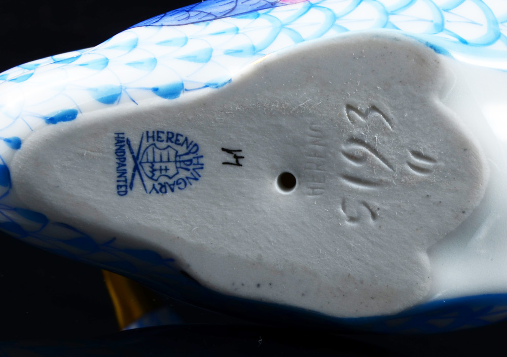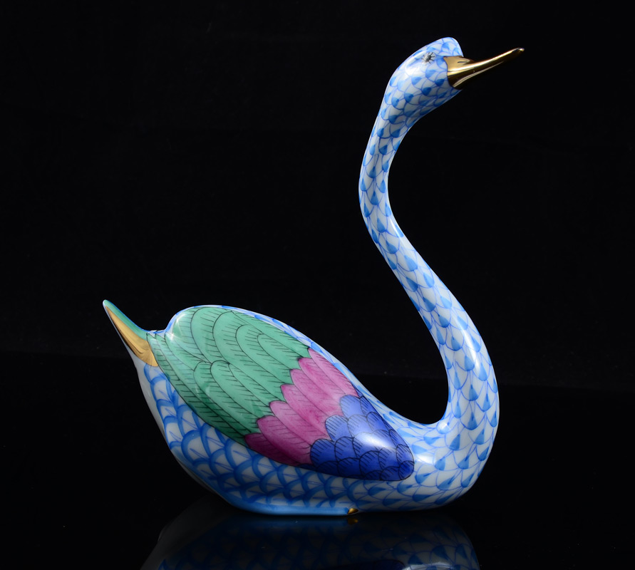 HEREND PORCELAIN SWAN FIGURINE: Polychrome hand painted, base with blue Herend mark. 5 3/8'' h. x 4 1/2'' x 2 1/4''.