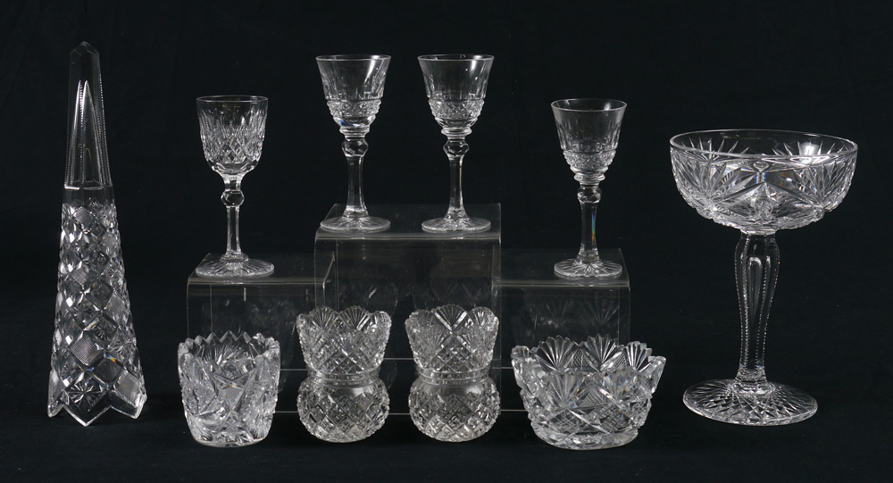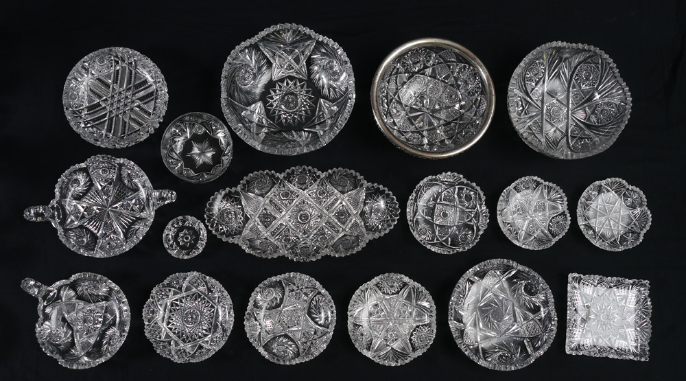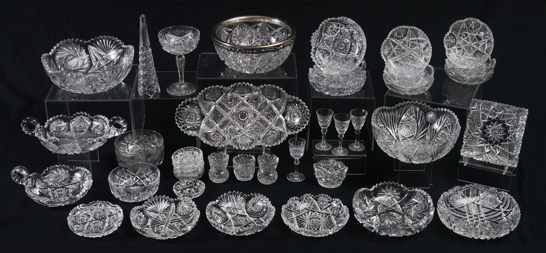 MEGA ESTATE LOT OF BRILLIANT PERIOD CUT GLASS: Approx. 37 pieces to include a sterling rim berry bowl, 2 additional bowls (8-9''), ice cream dishes, nappies, assorted small dishes, toothpick holders, celery, and salts.