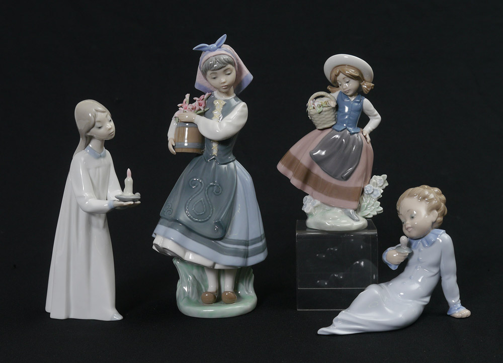 4 LLADRO PORCELAIN FIGURINES: 1) GIRL WITH CANDLE 4868, Fulgencio Garcia sculptor, issued 1974 retired 1991, 8''h., factory flaw/straw mark to back of head. 2) FROM MY GARDEN 1416, Francisco Catala sculptor, issued 1982 retired 1997, 10.5''h. 3) SWEET SCENT 5221, Jose Puche sculptor, issued 1984 retired 2004, 6.5''h. 4) BABY W/ PACIFIER 5099, Salvador Debon sculptor, issued 1982 retired 1985, 5''h. Sold as a lot.