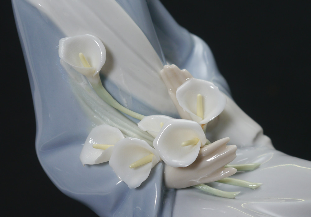 3 LLADRO PORCELAIN FIGURINES: 1) GIRL WITH LILIES SITTING 4972, Jose Javier Malavia sculptor, issued 1977 retired 1991, 9.5''h. Most calla lilies have chips. 2) MADONNA HEAD 4649, Vincente Martinez sculptor, issued 1969 retired 2001, 8.75''. 3) GIRL WITH CALLA LILIES 4650, Vincente Martinez sculptor, issued 1969 retired 1998, 9''h.