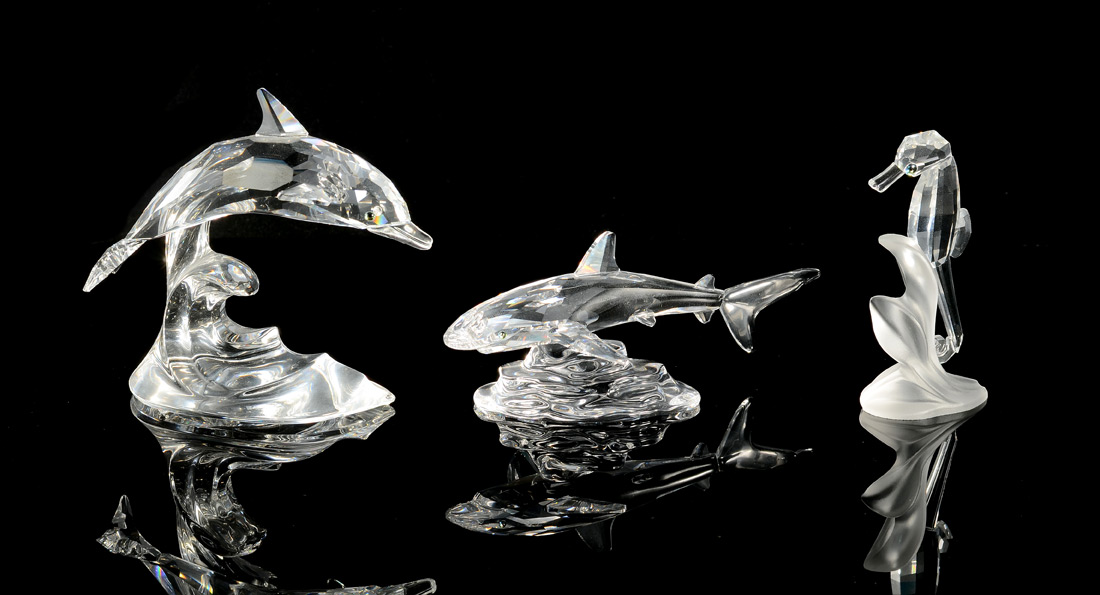 SWAROVSKI CRYSTAL FIGURINES: 3 piece to include, DOLPHIN 7644 000 001, Michael Stamey designer, 1995 - active, 3 7/8''; BABY SHARK 7644 000 007, Anton Hirzinger designer, 2001-2004, 4 7/8''; and SEA HORSE 7614 080 000, Michael Stamey designer, 1993-2006, 3 1/8''.