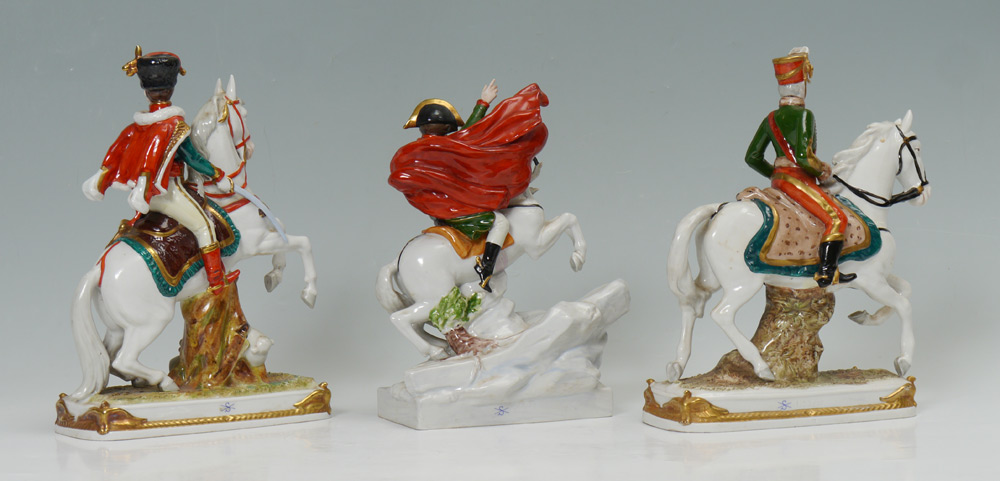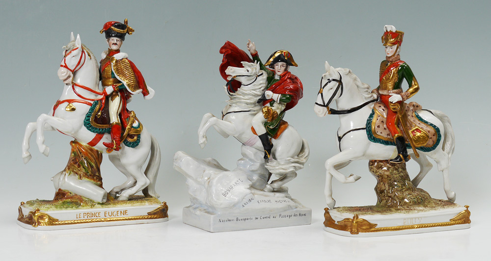 SCHEIBE-ALSBACH PORCELAIN MILITARY HORSEMAN FIGURES: Porcelain figures of Napoleon, Prince Eugene and Pully. Finely detailed and painted. Measures approx. 11'' tall x 8'' x 3.5''. 20th C.