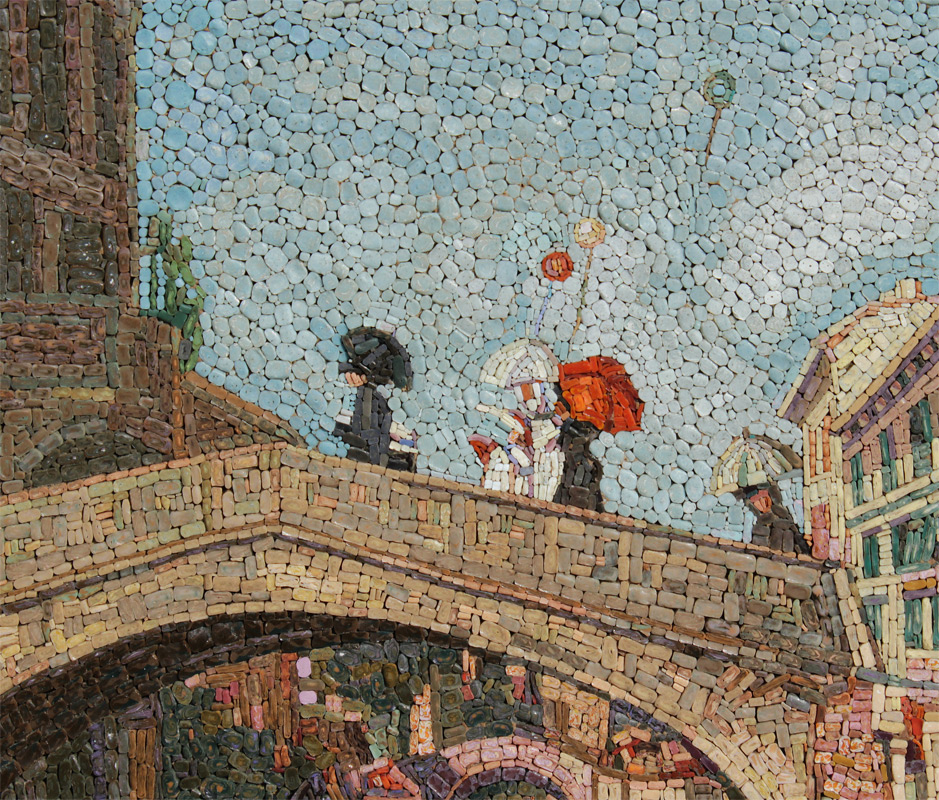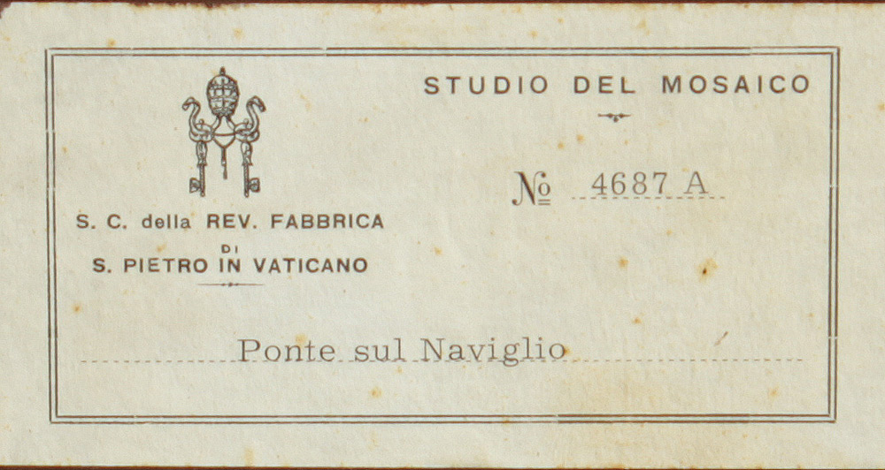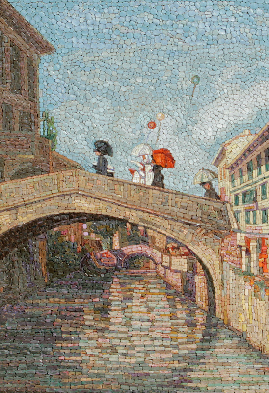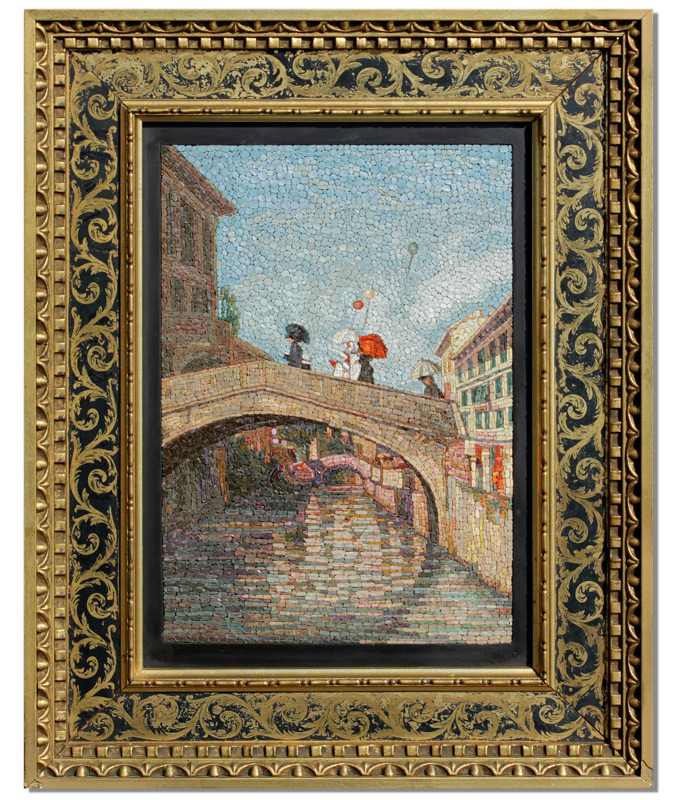 VATICAN MICROMOSAIC ''PONTE SUL NAVIGLIO'': Sight size 13 3/4'' x 9 1/2'', custom original carved and gilded frame, 19 1/4'' x 15'', labeled verso Studio del Mosaico, S.C. della Rev. Fabbrica di S. Pietro in Vaticano, and titled.