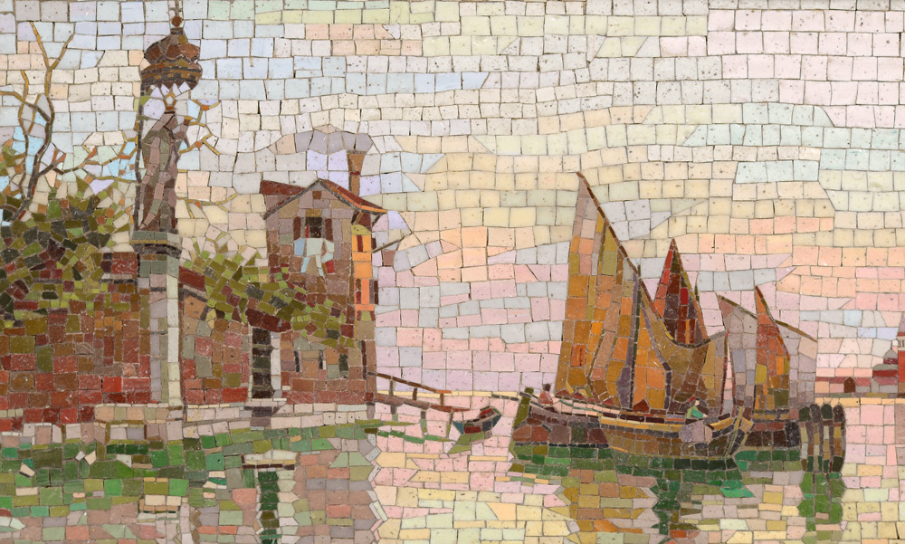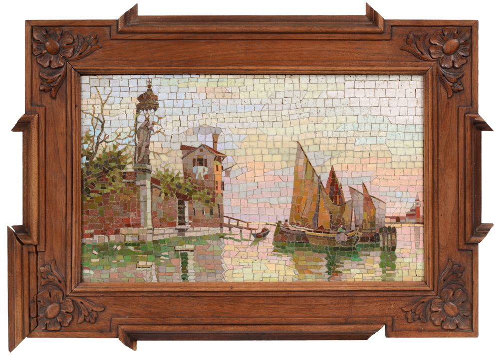 LARGE MICRO MOSAIC VENETIAN CANAL PLAQUE: Sight size 10 3/4'' x 18 1/4'', encased in a partial carved wooden frame, approximately 100+ years old 17 1/2'' x 27''.