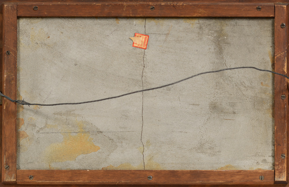 CONDITION: There is a vertical stress crack in the backing that does not reflect to the front, frame is in need of repair/restoration, sold as is.