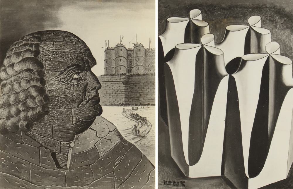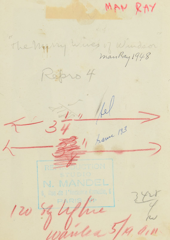 2 VINTAGE PHOTOGRAPHS OF MAN RAY WORKS: 2 piece lot to include 1) Photograph of a painting, ''The Merry Wives of Windsor'', 1948, N. MANDEL studio stamp, 6 3/8'' x 4 7/8''. 2) Photograph of a painting, ''Imaginary Portrait'', 1940, 9 1/2'' x 7 5/8''.