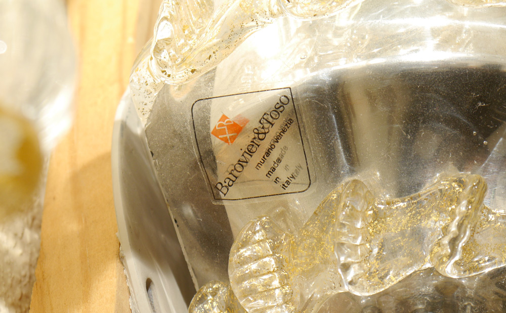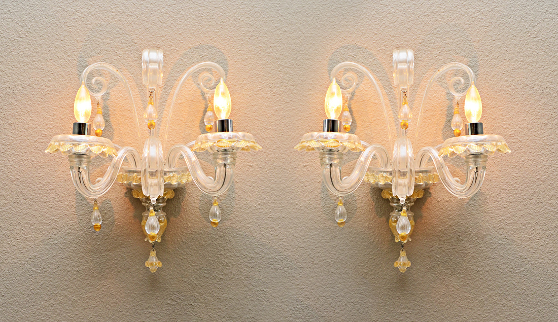 PAIR BAROVIER & TOSO ''RABAT'' MURANO SCONCES: Pair of 2 light electric Italian Venetian glass sconces in the Rabat pattern by Barovier & Toso with gold aventurine highlights. Overall measure 17 1/2'' h. x 13'' x 8''.