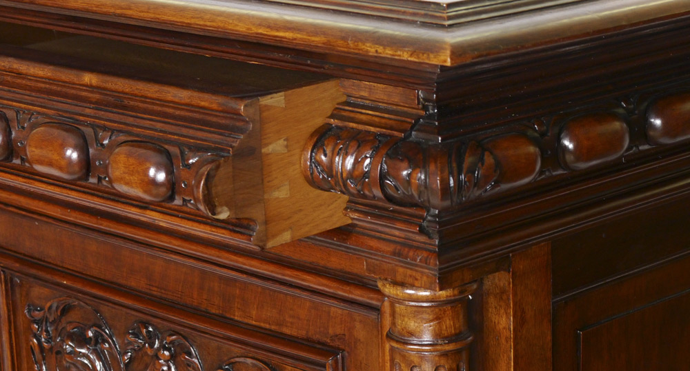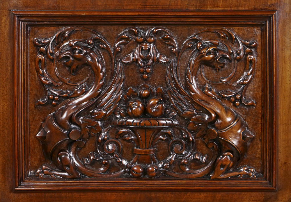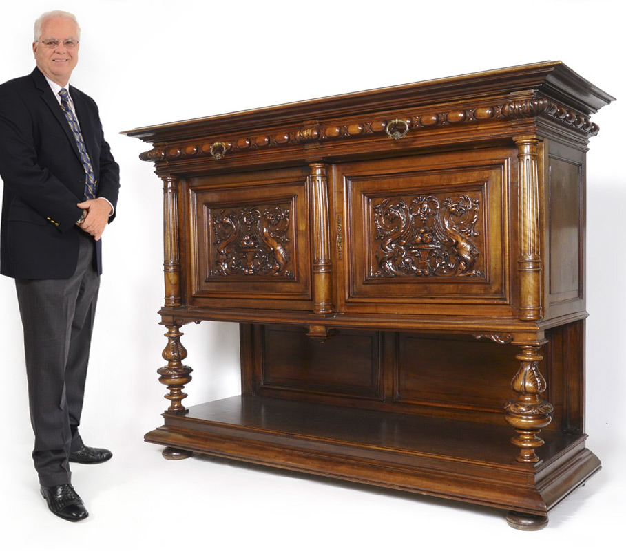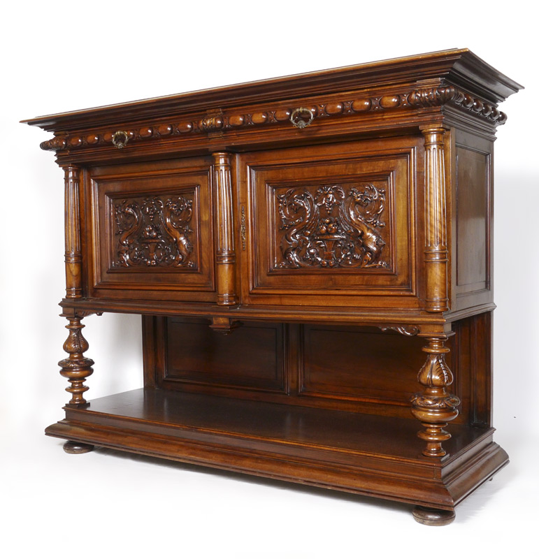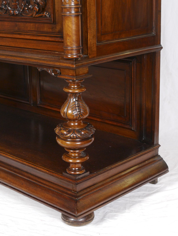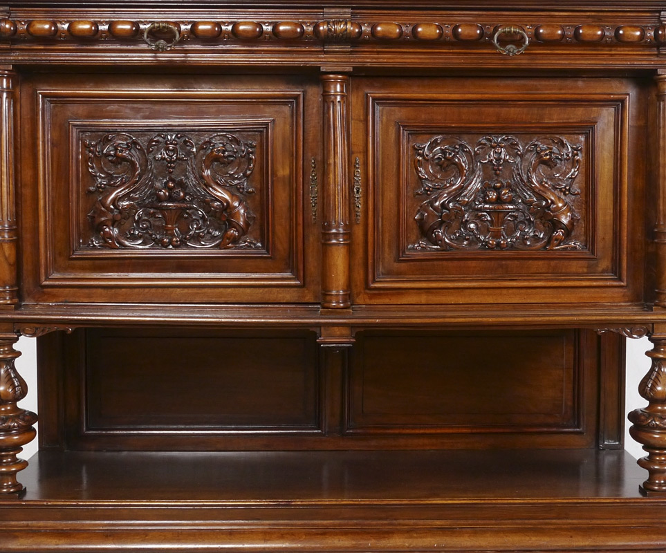 FRENCH FIGURAL DRAGON CARVED WALNUT HUNTBOARD: Stepped pediment over 2 drawers with egg and dart trim, 2 doors with carved figural dragon doors, single interior shelves, fluted full column supports. Lower open shelf with carved and turned supports, all on front bun feet. 52 1/4'' h. x 69 1/4'' x 23 1/2''. See matching credenza next lot 1022.