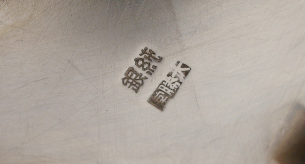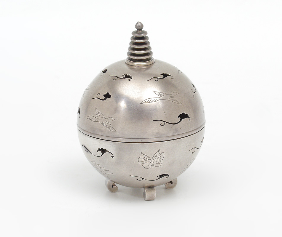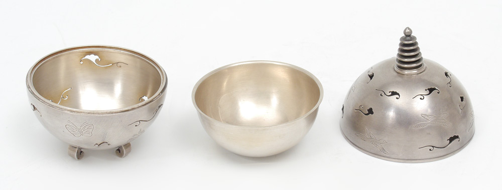 CHINESE EXPORT SILVER COVERED LIBATION CUP: Round 2 part with pierced clouds and engraved birds in flight, concentric circle finial, marks with Chinese silver marks and unidentified makers mark on base, on 4 feet. Removable insert, overall measures 4'' h. x 3'', approx. 8.7 troy oz.