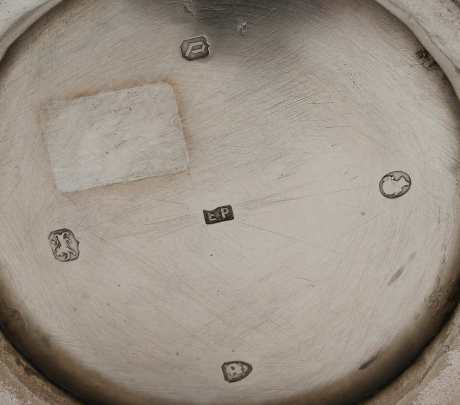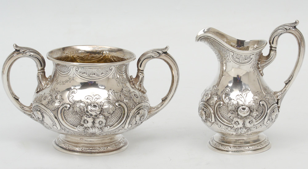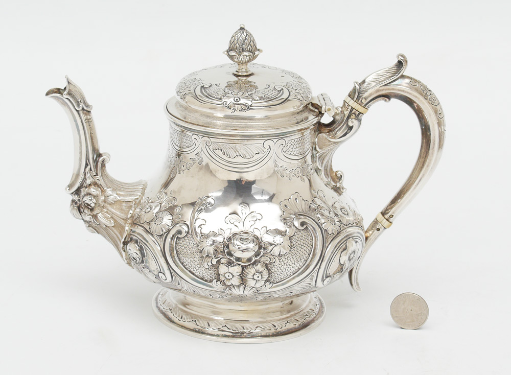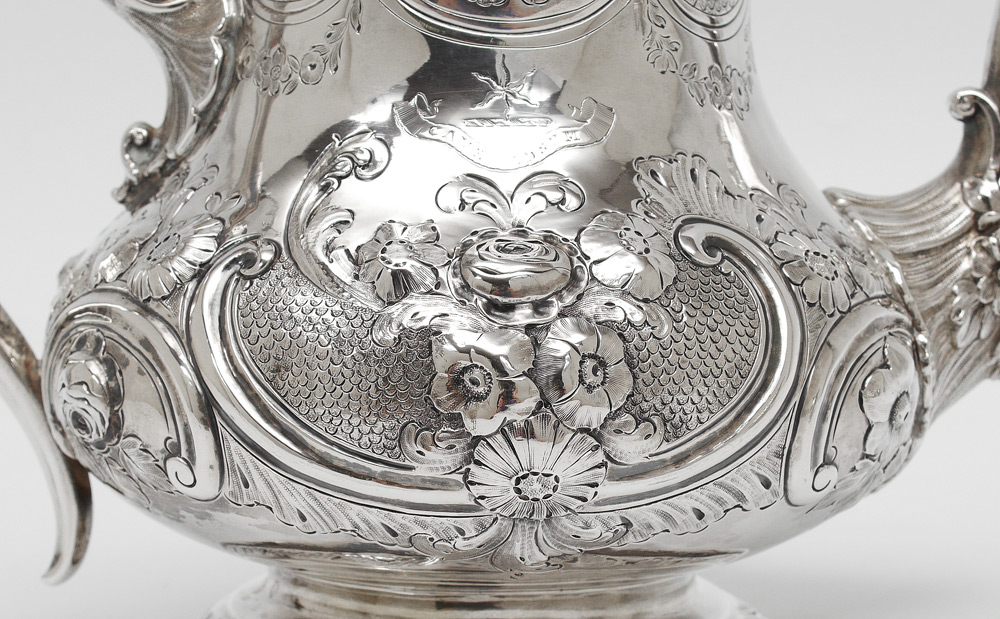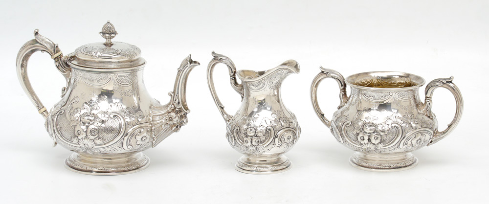 1859 CLAN JARDINE ENGLISH SILVER TEA SERVICE: 3 piece tea service hallmarked 1859 London, Edward Pairpoint makers mark, each with repousse floral and floiate motifs, engraved Scottish Clan Jardine spur over motto ''Cave Adsum (Beware, I am here)''. To include 1) Teapot with hinged lid, pineapple finial, 7 1/2'' h. x 10''. 2) Open creamer 5 3/4'' h. x 5''. 3) Open sugar with double handles, 4 3/4'' x 8''. Approx. 54.3 troy oz.