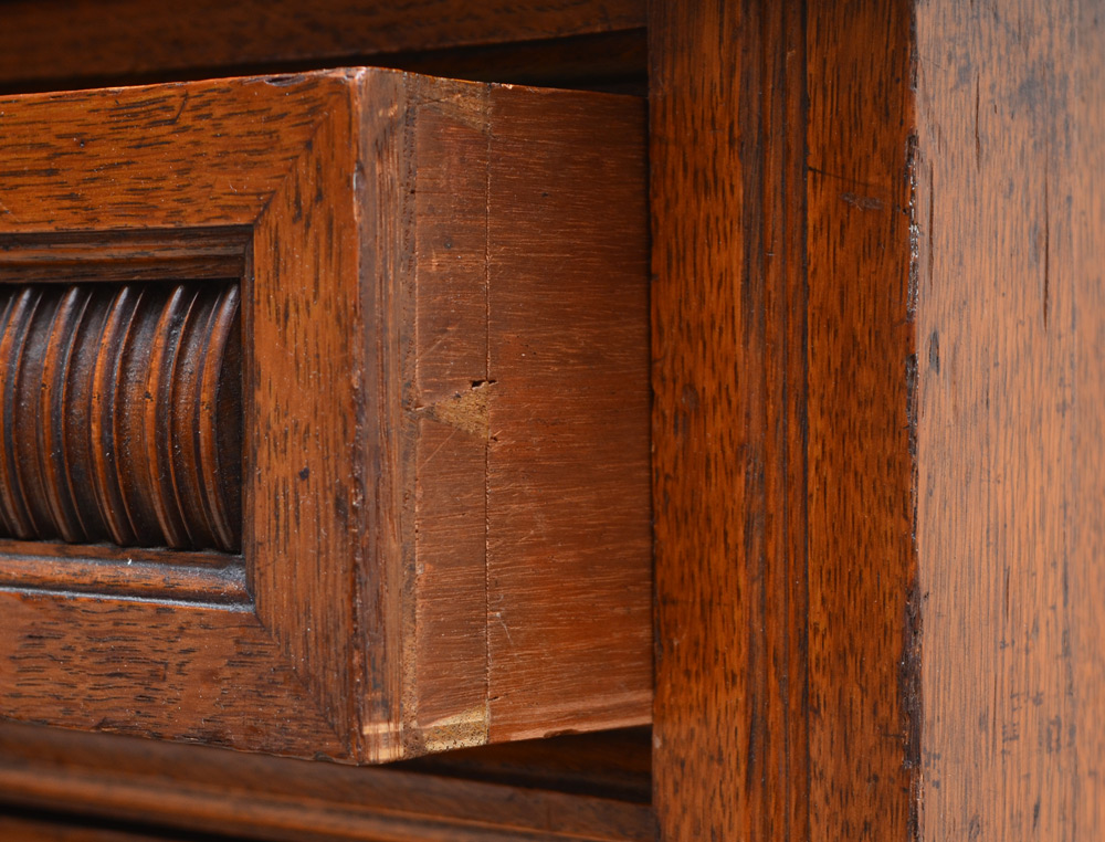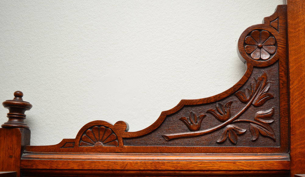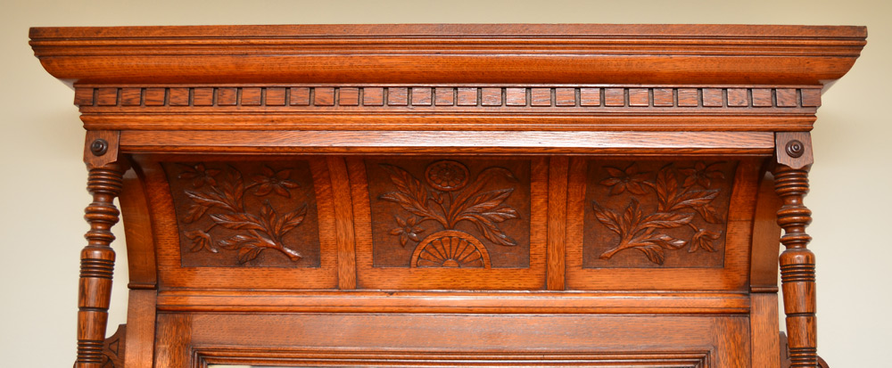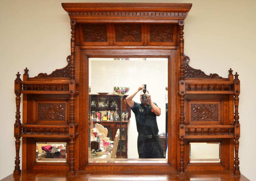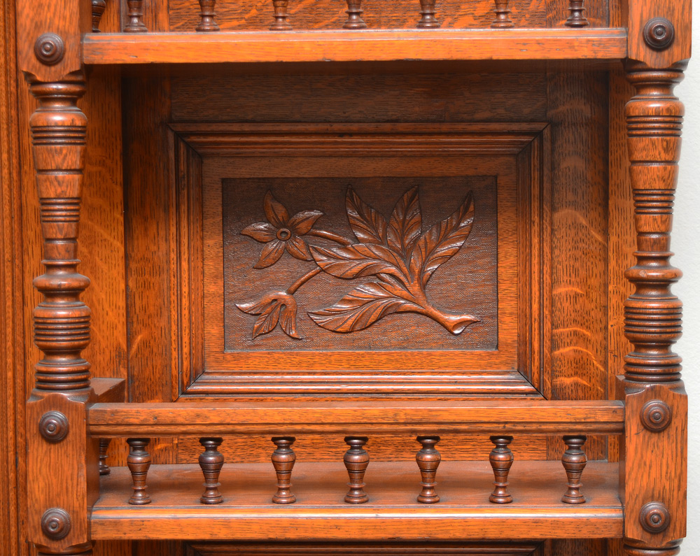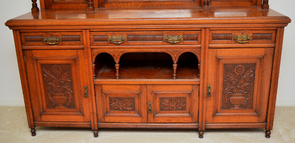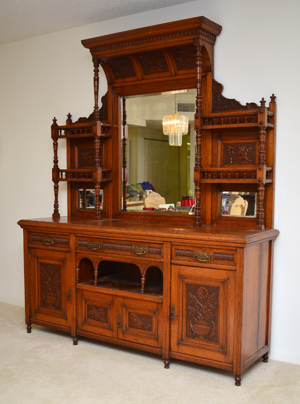 IMPRESSIVE HIGH VICTORIAN OAK SIDEBOARD: Concave pediment with carved panels, turned supports, central beveled mirror back surmounted by 2 shelves either side with carved panels and mirrors. Base with 3 drawers over center section has open shelf with gallery over 2 doors, door either side, all on turned feet. Overall measures 94'' h x 79'' x 23''.