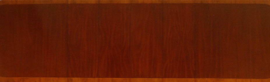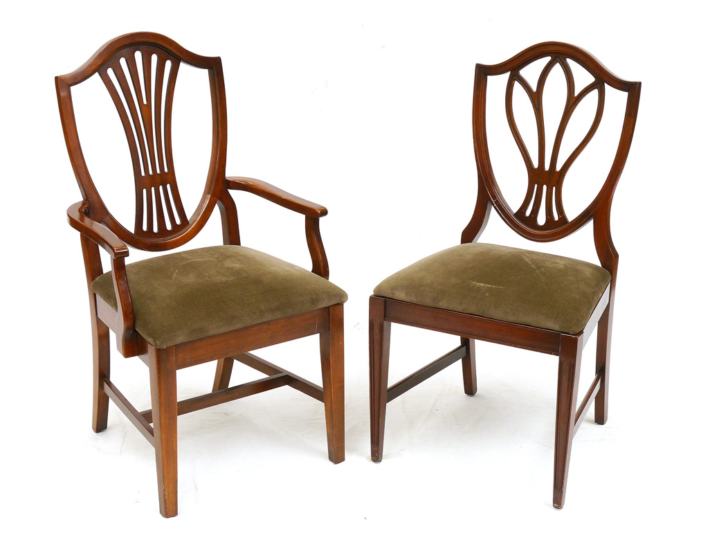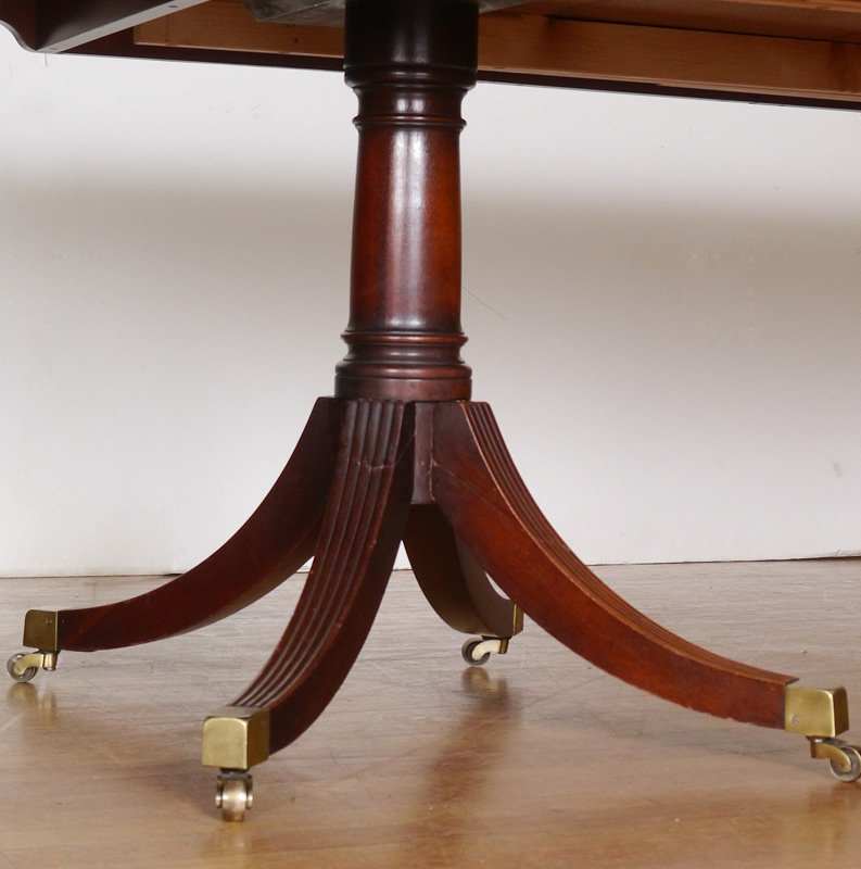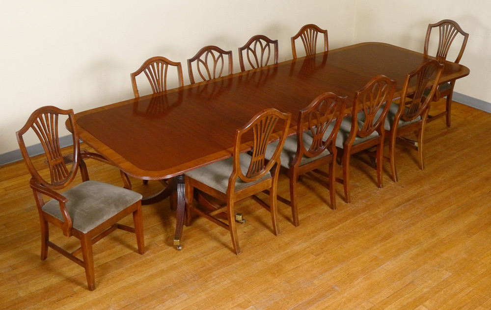 BANDED MAHOGANY DOUBLE PEDESTAL DINING TABLE & 10 CHAIRS: Banded mahogany top, double pedestal base with fluted splayed legs ending in brass castors. 29'' h. x 74 1/2'' x 46 1/4'', four 14'' leaves. Sold with 10 shield back chairs, in two patterns. 2 arm chairs measure 39 3/4'' h. x 22'' x 22''.