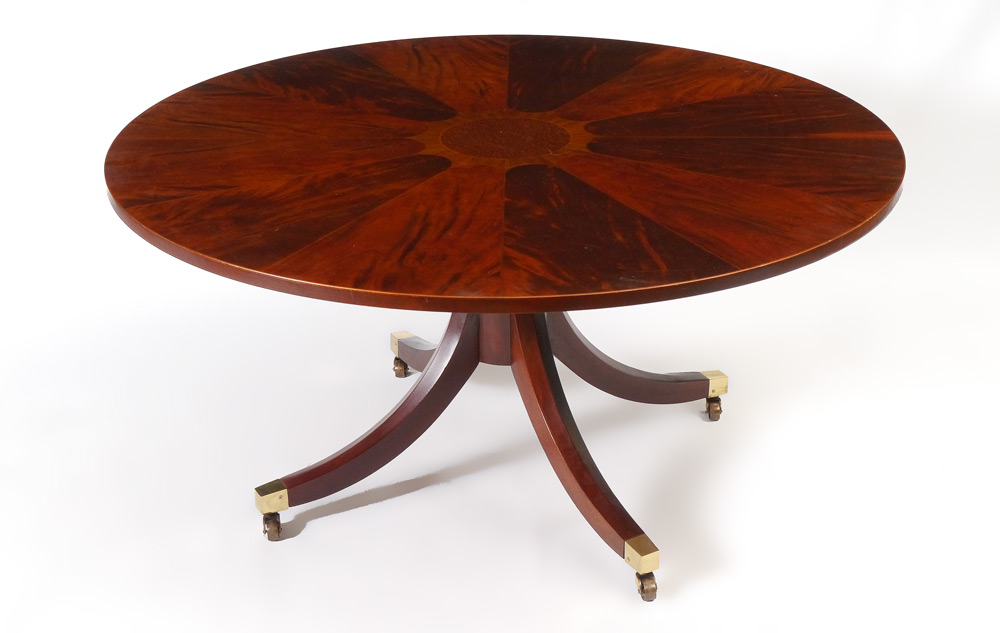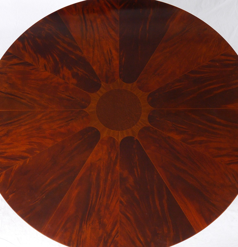 BAKER ROUND INLAID MAHOGANY LOW TABLE: Inlaid with a flower design, burl central medallion, flame mahogany ''petals'', turned pedestal base with 4 splayed legs. Baker metal tag under top. Measures 22'' h. x 46'' dia.