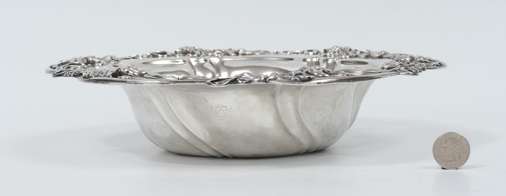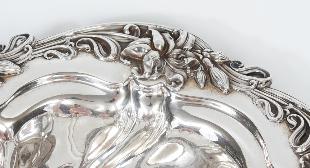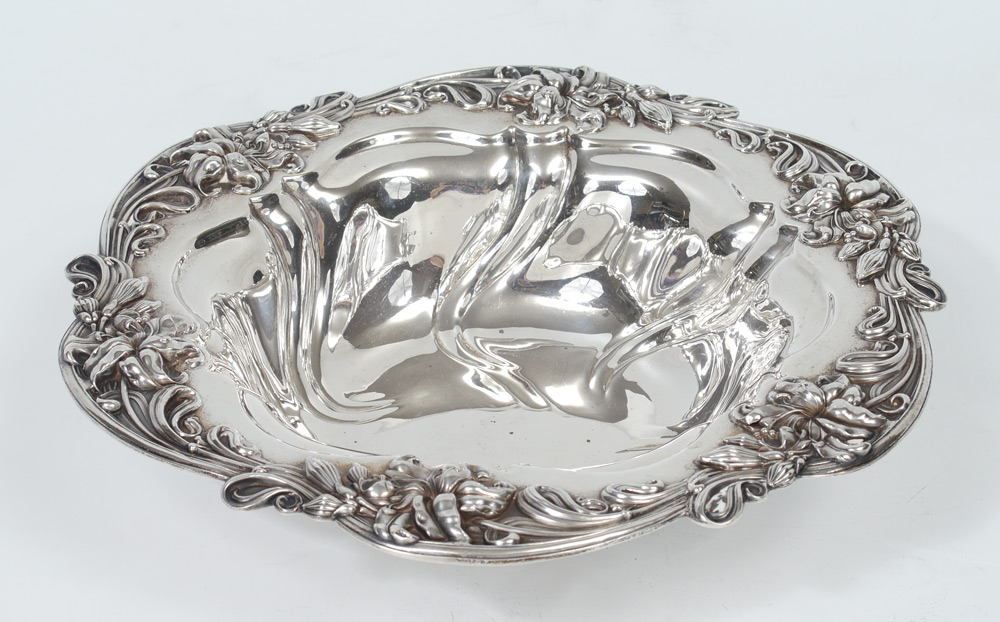 MERIDEN BRITTANIA STERLING CENTER BOWL: Art nouveau bowl with floral motif rim, marked with Meriden Brittania mark, Sterling, 654. Measures 2 3/4'' h. x 11 3/4'', approx. 15.9 troy oz.