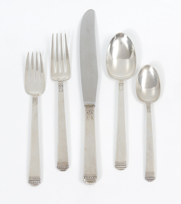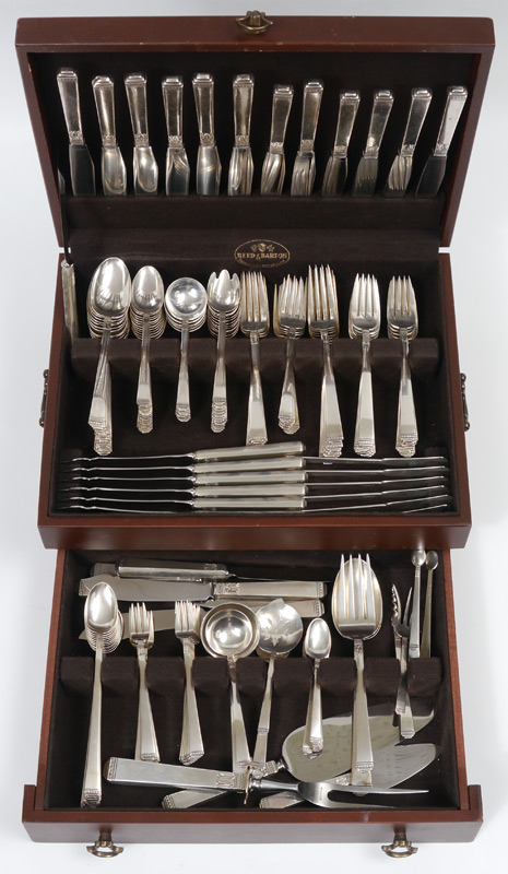 LUNT REGENCY STERLING FLATWARE: Approx. 157 pieces in the Regency pattern by Lunt to include 6 forks (7 1/2''), 5 forks (7 1/8''), 6 salad forks (6 1/4''), 12 forks (7''), 12 ice cream forks (5 3/4''), 12 cocktail forks (5 3/8''), olive fork (5 5/8'') 12 spoons (7 1/8''), 13 teaspoons (6''), 12 soup spoons (5 3/8''), 12 iced tea spoons (7 1/2''), 12 demitasse spoons (4 1/2''), 6 hollow knives (9 1/2''), 6 hollow knives (9''), 12 hollow fish knives (8 7/8''), 6 solid butter knives (5 7/8''), 2 tablespoons (8 1/2''), serving fork (7 3/4''), lemon fork (5 1/4''), gravy ladle (6 1/2''), cream ladle (5 5/8''), butter pick (6 1/8''), pierced bon bon spoon (4 7/8''), jelly spoon (6 1/4''), sugar tongs (4 3/8''), hollow cake server (10''), pie server (6 1/2''), meat carving fork (10 3/4''). Silver chest currently holding set not included. Approx. 144.9 troy oz.