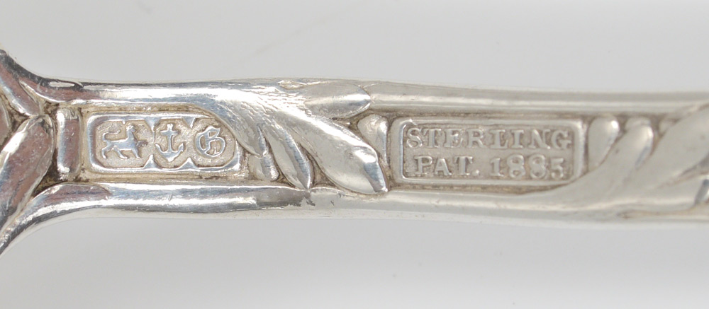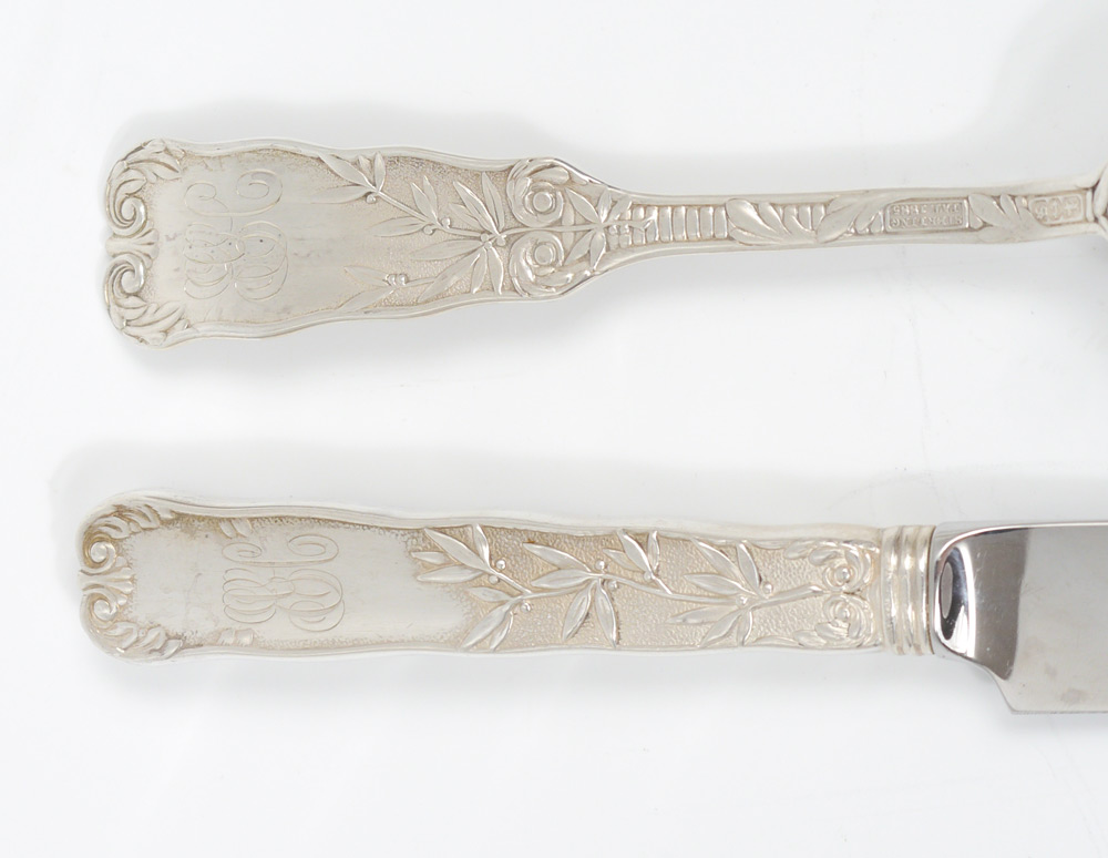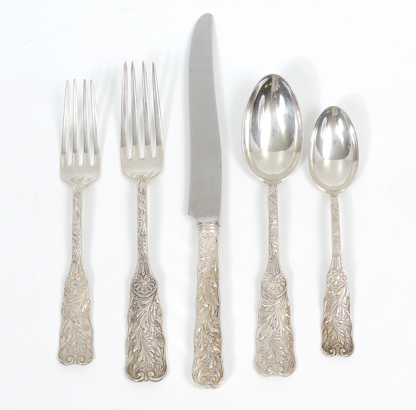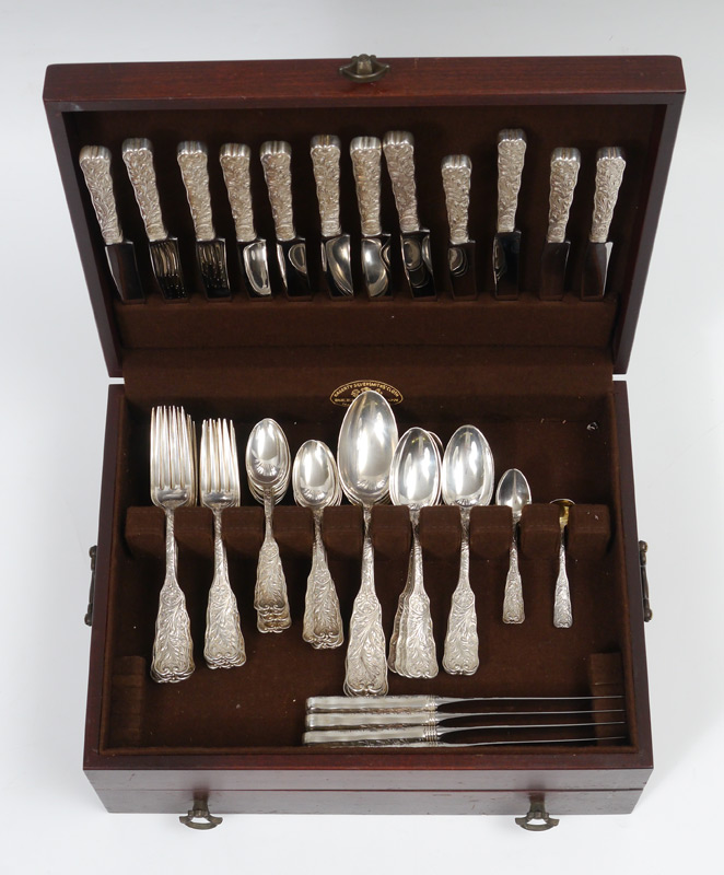 GORHAM ST. CLOUD STERLING FLATWARE: Approx. 67 pieces in the St. Cloud pattern by Gorham to include 8 forks (7 5/8''), 8 salad forks (6 3/4''), 16 teaspoons (6''), 8 soup spoons (7''), 5 demitasse spoons (4 3/8''), 2 salt spoons (3 5/8''), 4 tablespoons (8 5/8''), 8 hollow French knives (9 3/8''), 8 hollow French knives (8 3/4''). Most, but not all, pieces monogrammed. Silver chest currently housing set not included. Approx. 80.8 troy oz.