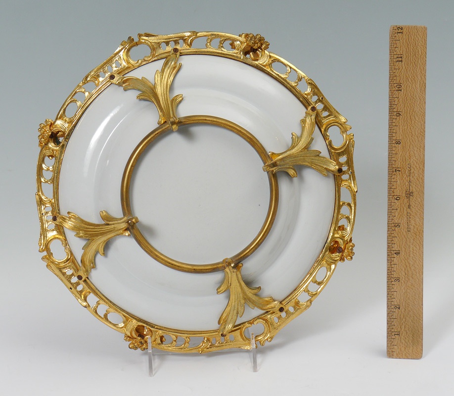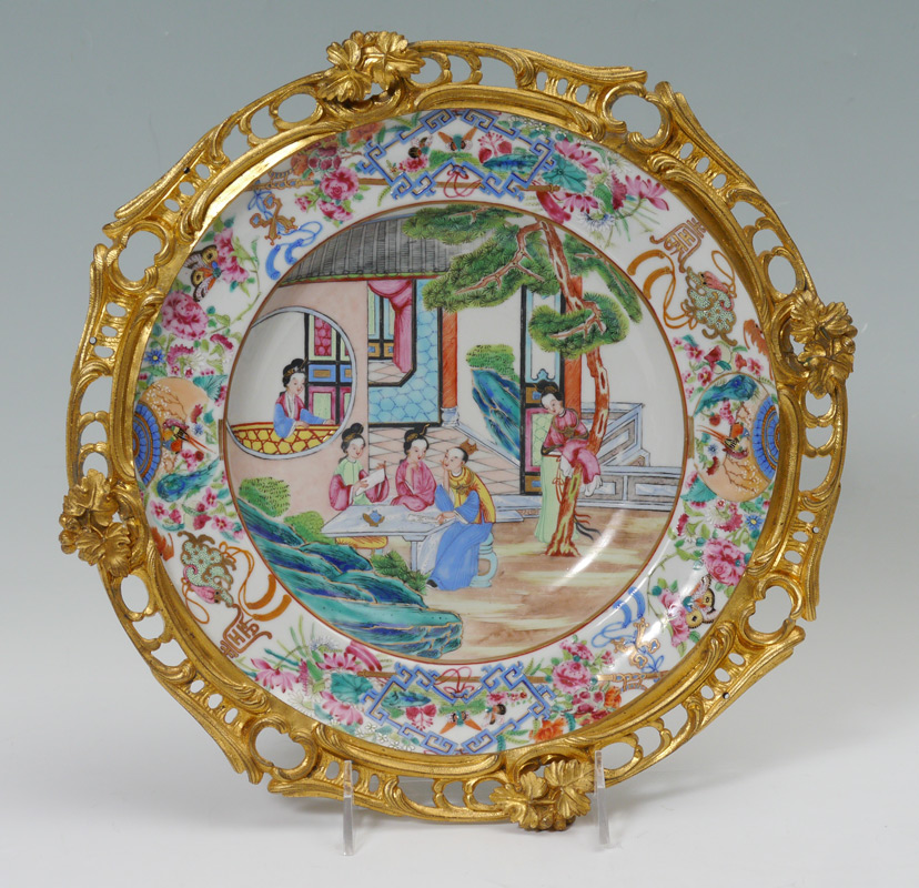 ORMOLU MOUNTED CHINESE BOWL: Enamel and paint decorated shallow bowl with scene of Geisha at an outdoor table. Raised in a gilt open work frame on four feet. Unmarked. 3 1/2''h. plus leaf finials, 12 1/4'' diameter.