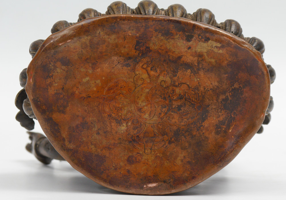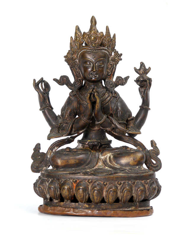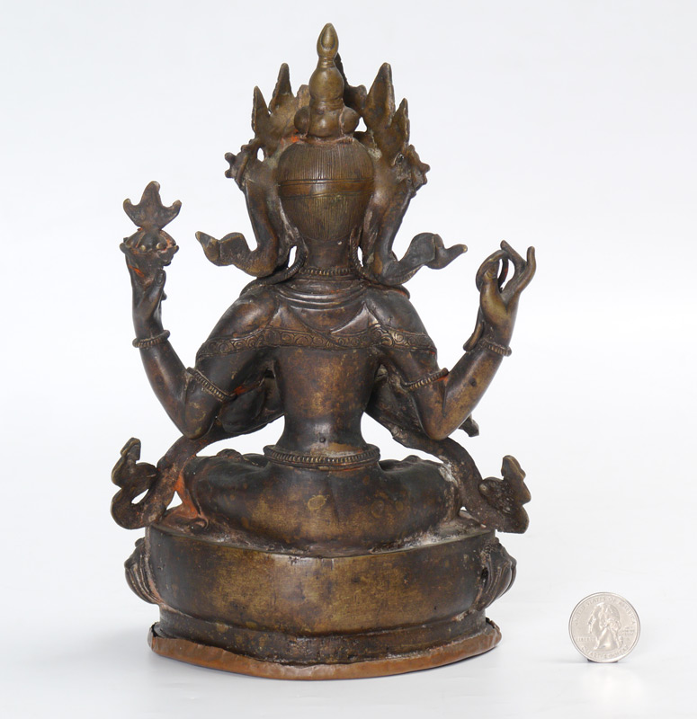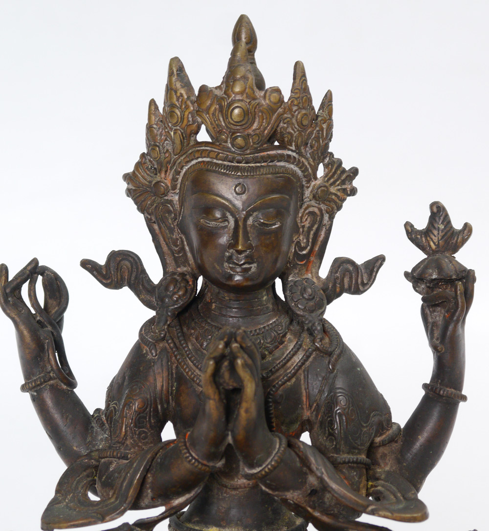 TIBETAN BRONZE SEATED CHENREZIG BUDDHIST FIGURE: Figure of Chenrezig, Bodhisattva of Compassion, seated with 4 arms, inner 2 praying, right hand holding beads, left a lotus blossom. Traces of gilt and red decoration remain. Base with engraved floral symbol, overall measures 8 3/4'' h. x 6''.