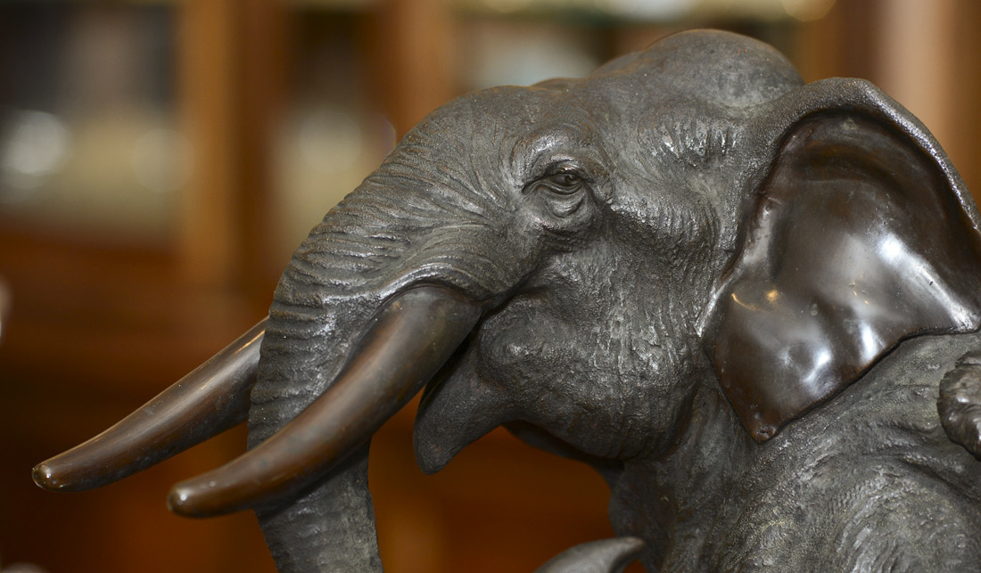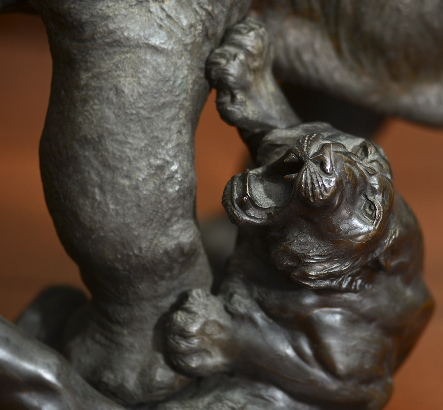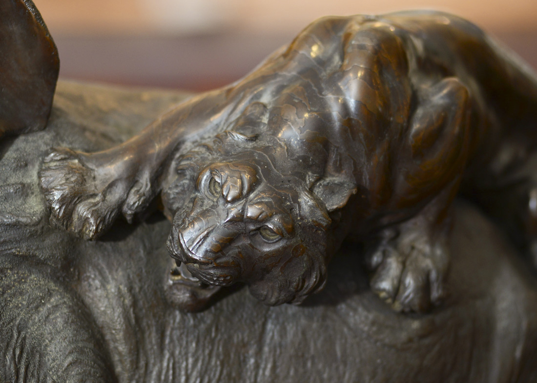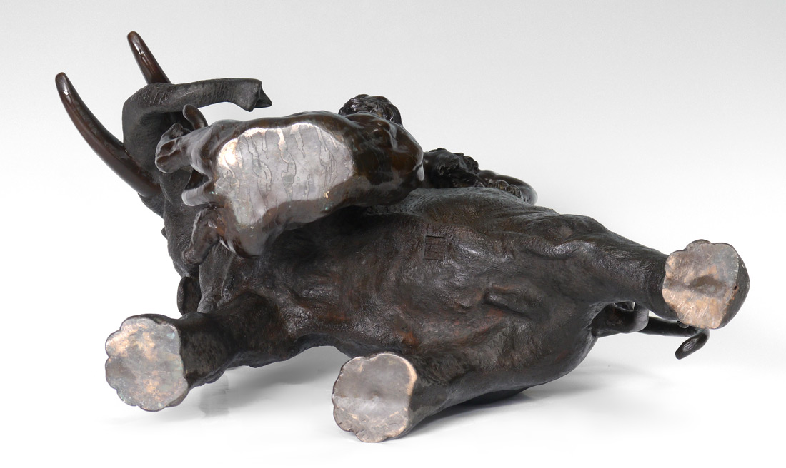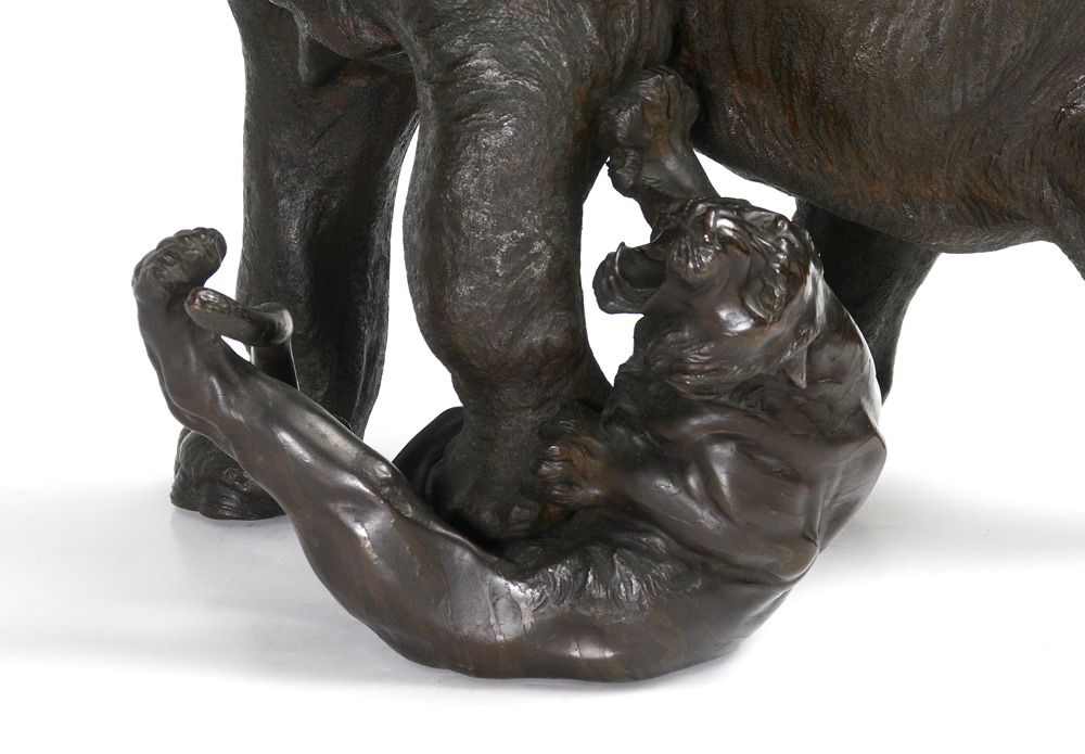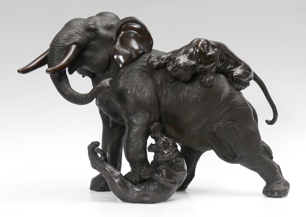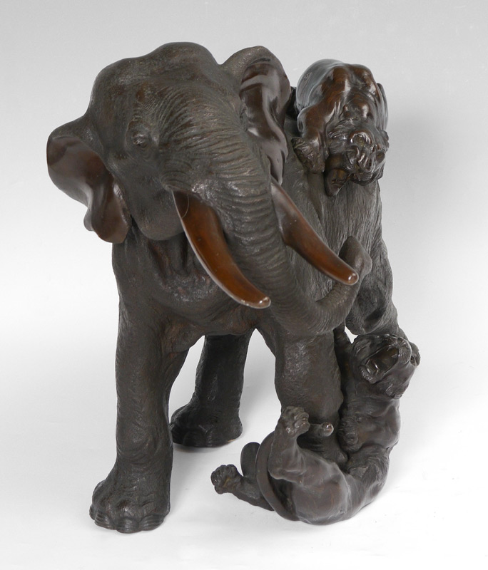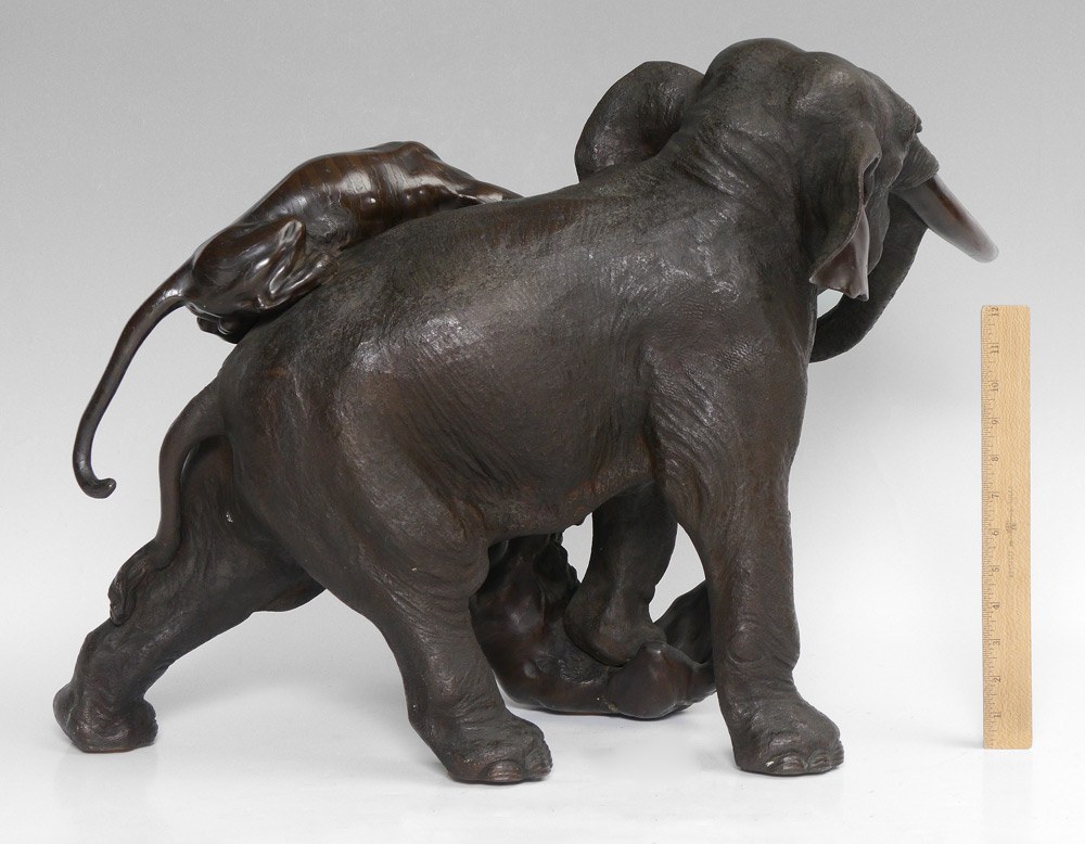 MASSIVE MEIJI PERIOD JAPANESE BRONZE ELEPHANT & ATTACKING TIGERS SIGNED GENRYUSAI SEIYA: A finely detailed period bronze sculpture depicting a large muscular elephant under attack by two tigers. Meiji period marking on underbelly of the elephant. 19''h. x 27 1/2'' x 13 1/2'' w.