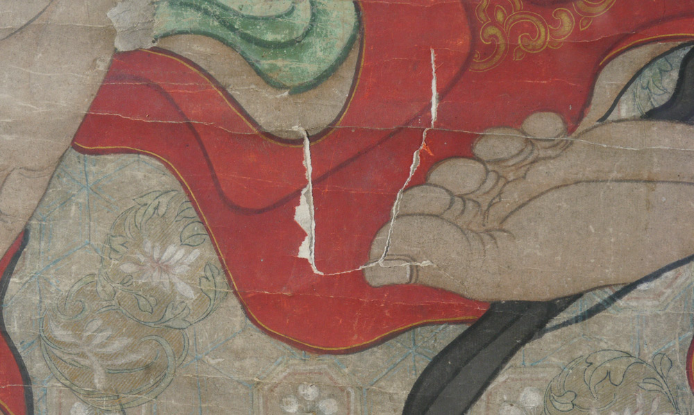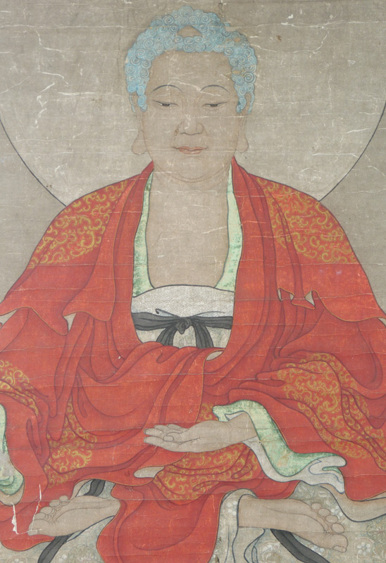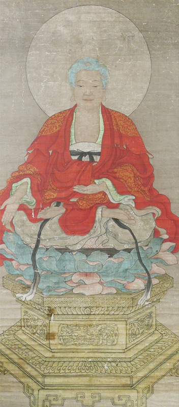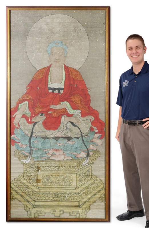 LARGE 7 FT TALL CHINESE ANCESTRAL WATERCOLOR: Oriental scroll of deity, 81 1/2'' x 37 1/2'', framed, 85 1/2'' x 42''.
