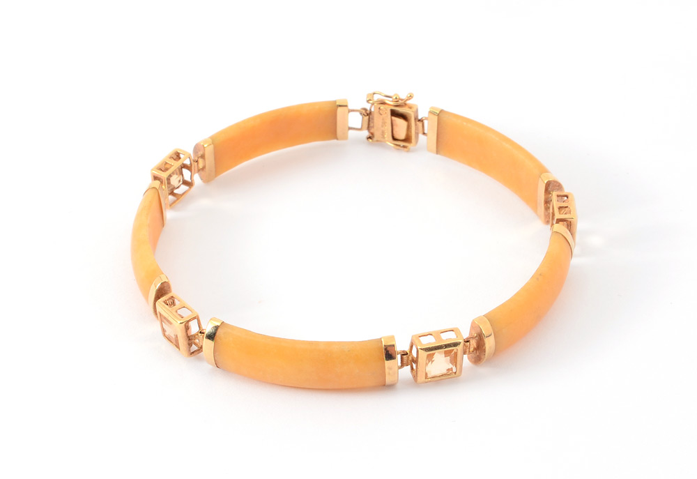 JADE & CITRINE BRACELET: 14K yellow gold bracelet with curved batons of ''mutton fat'' jade and square cut citrine. Gold weight: 10.0 grams. Approx. Length: 7''.