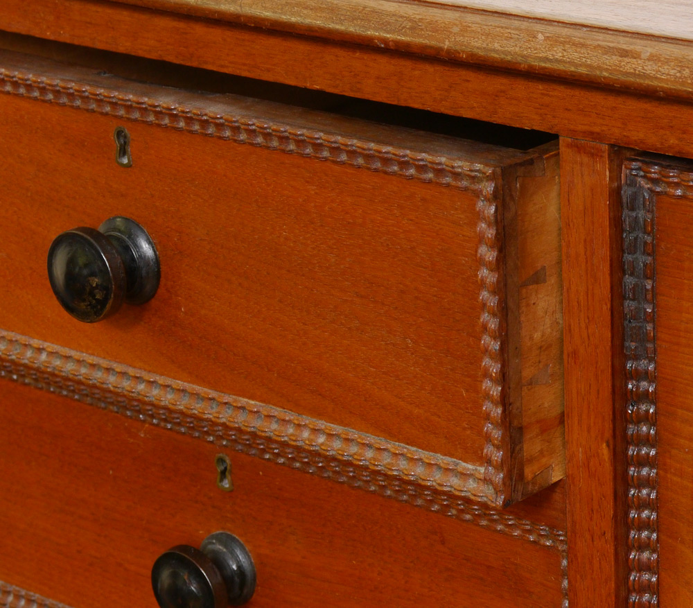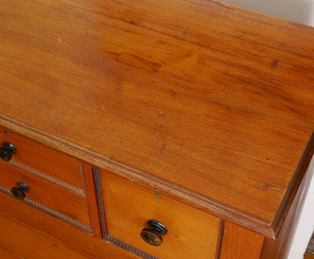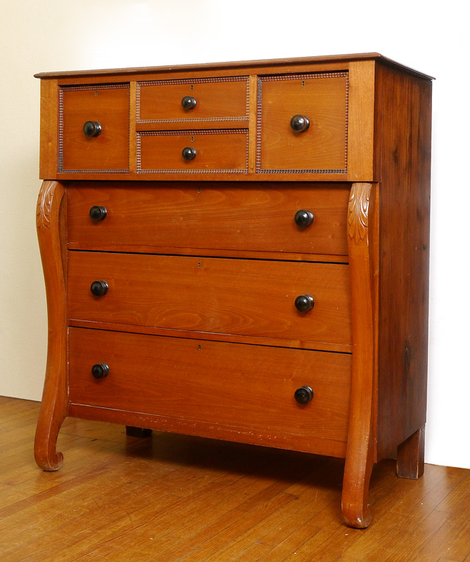 EMPIRE STYLE CHEST OF DRAWERS: Top section with 2 central drawers and 2 side drawers all with carved trim, over 3 full length drawers, carved and shaped stiles, scroll front feet. Overall measures 51'' h. x 46 1/4'' x 21 1/2''.